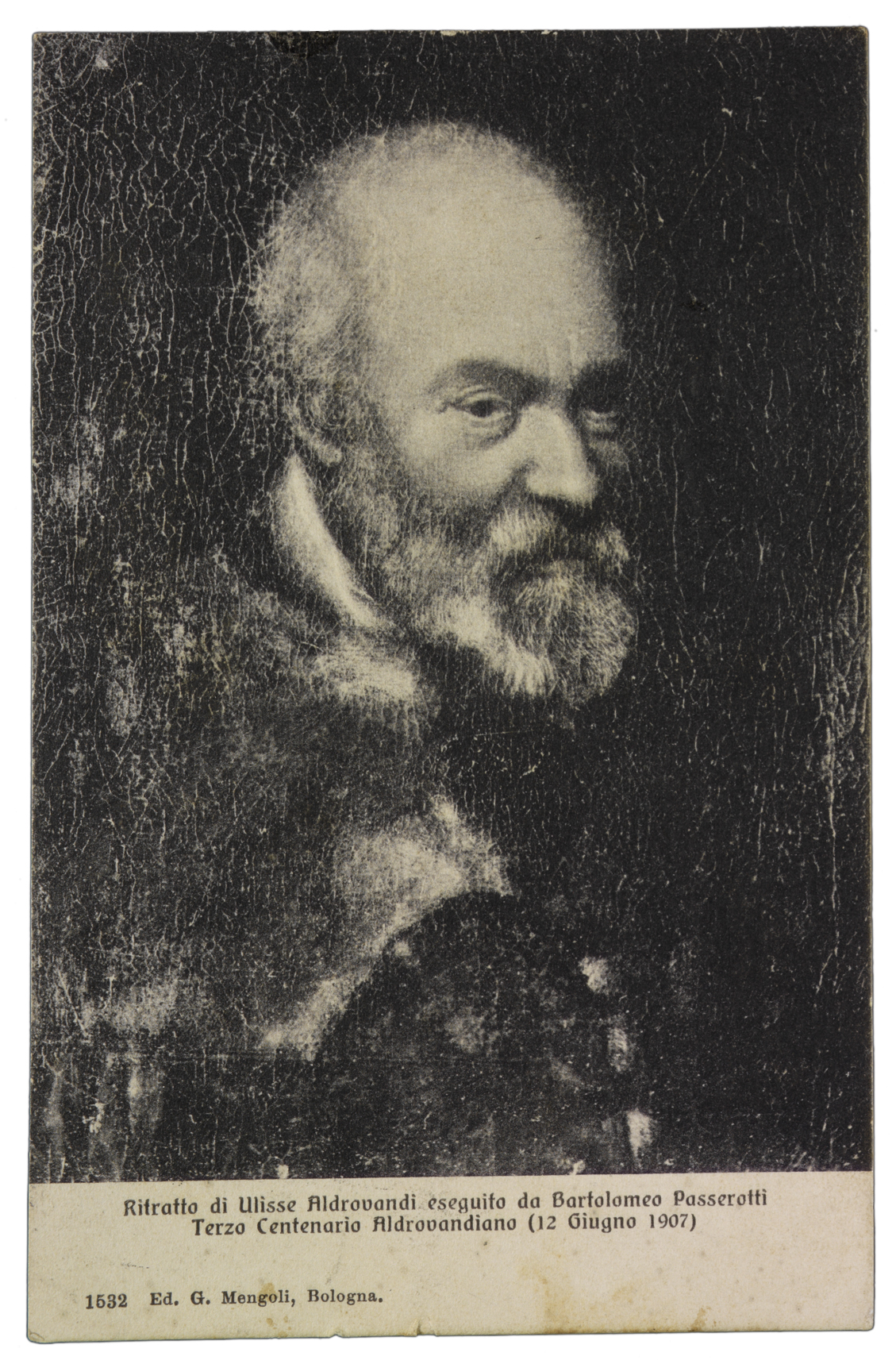 Sul recto compare la nota tipografica da cui è stato ricavato il titolo: Ritratto di Ulisse Aldrovandi eseguito da Bartolomeo Passerotti Terzo Centenario Aldrovandiano (12 giugno 1907). Scritte non leggibili sul verso.