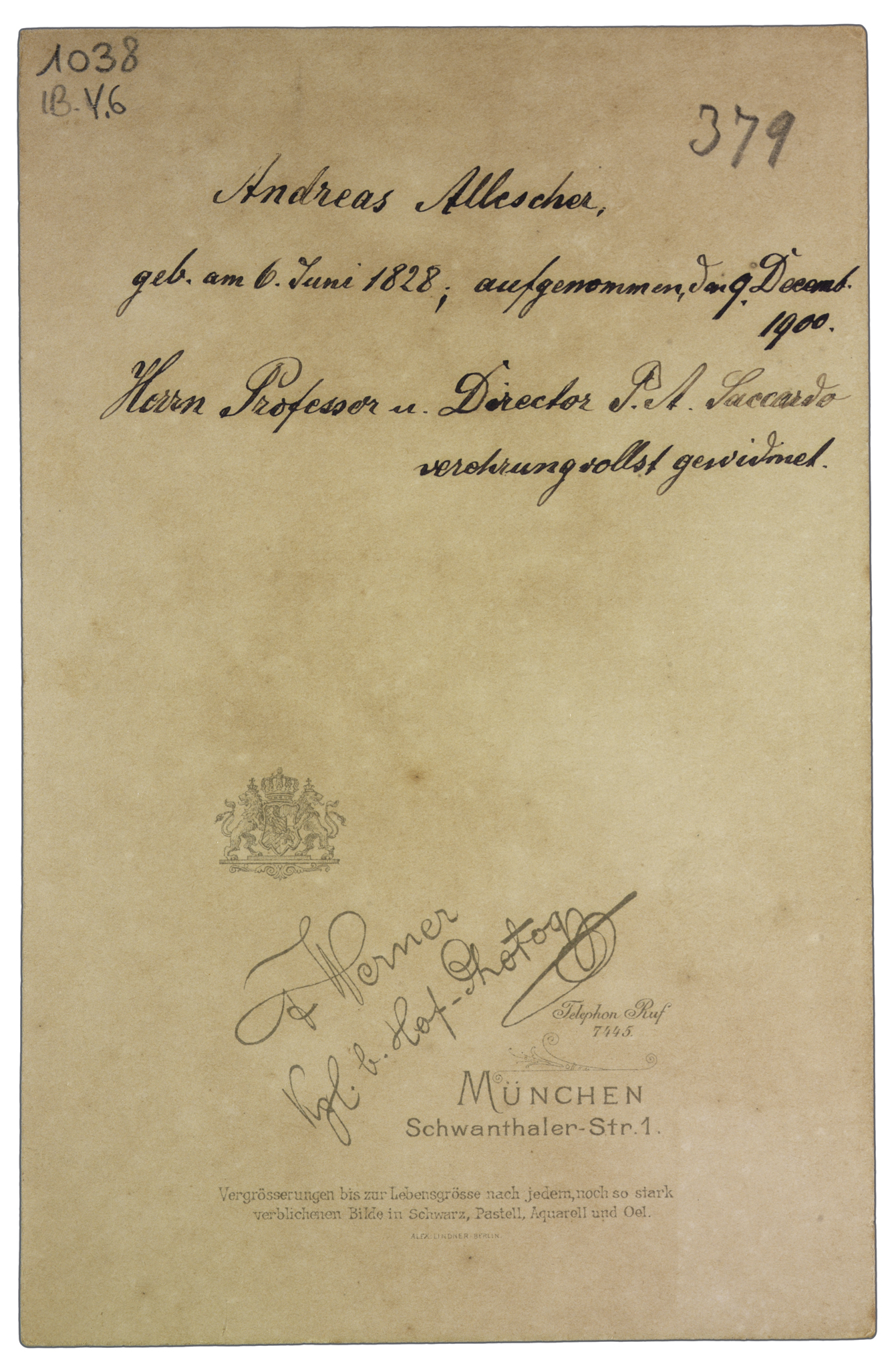 Titolo manoscritto sul recto, dove sono riportate due volte le date di nascita e della foto: Monaco n. 6 giugno 1828, fot.XII.900. Nota anche sul verso: Andreas Allescher, geb. am 6 Juni 1828; aufgenommen, [...] 9. Decemb. 1900. Herrn Professor u. Director P. A. Saccardo verohrung vollst gewidmet.