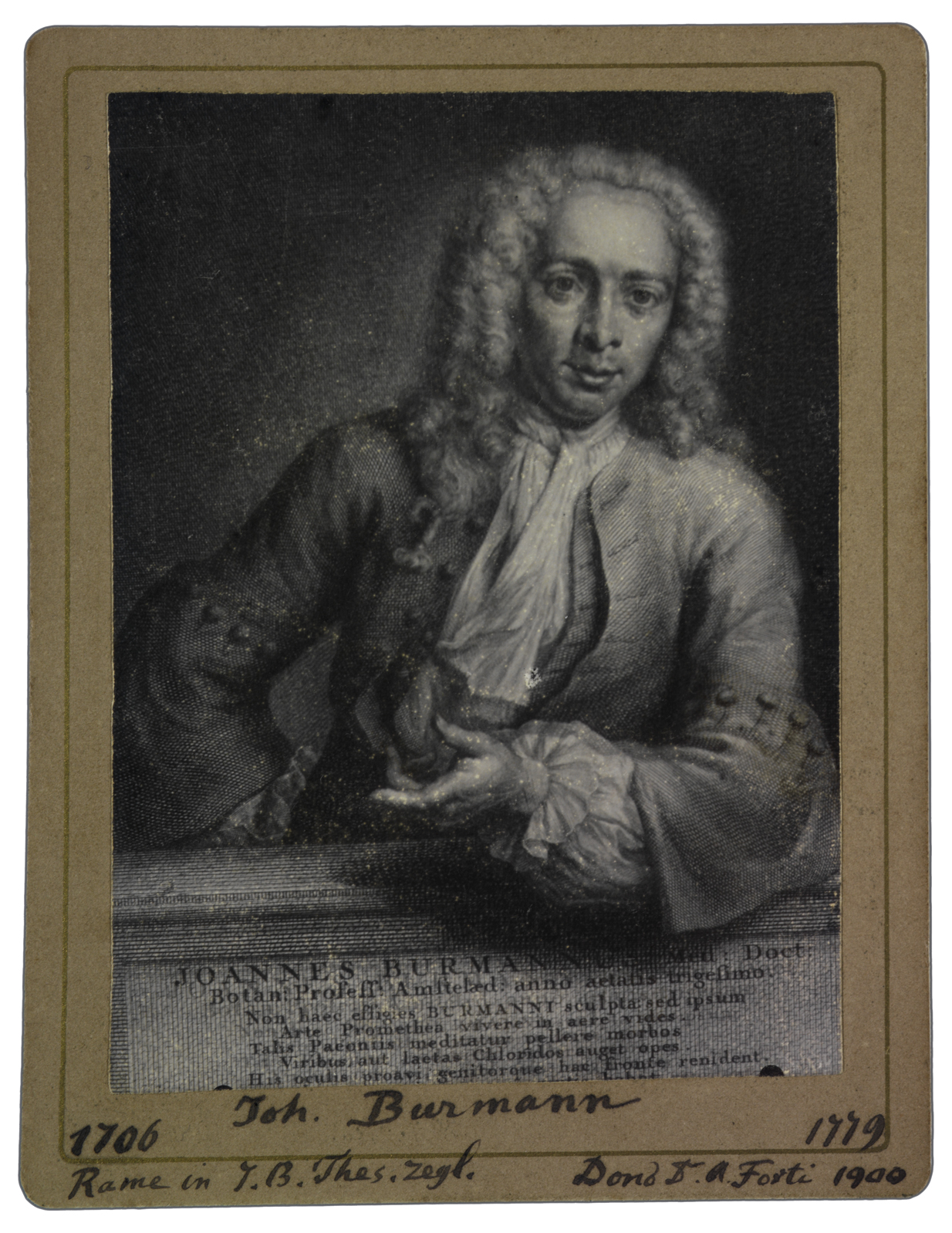 Titolo riportato sul recto, dove è riportata anche una piccola didascalia contenente alcune brevi informazioni sul botanico olandese. È riportato inoltre a livello manoscritto: Joh. Burmann 1706-1779. Rame in J. B. Thes. Zegl.; Dono D. A. Forti 1900.