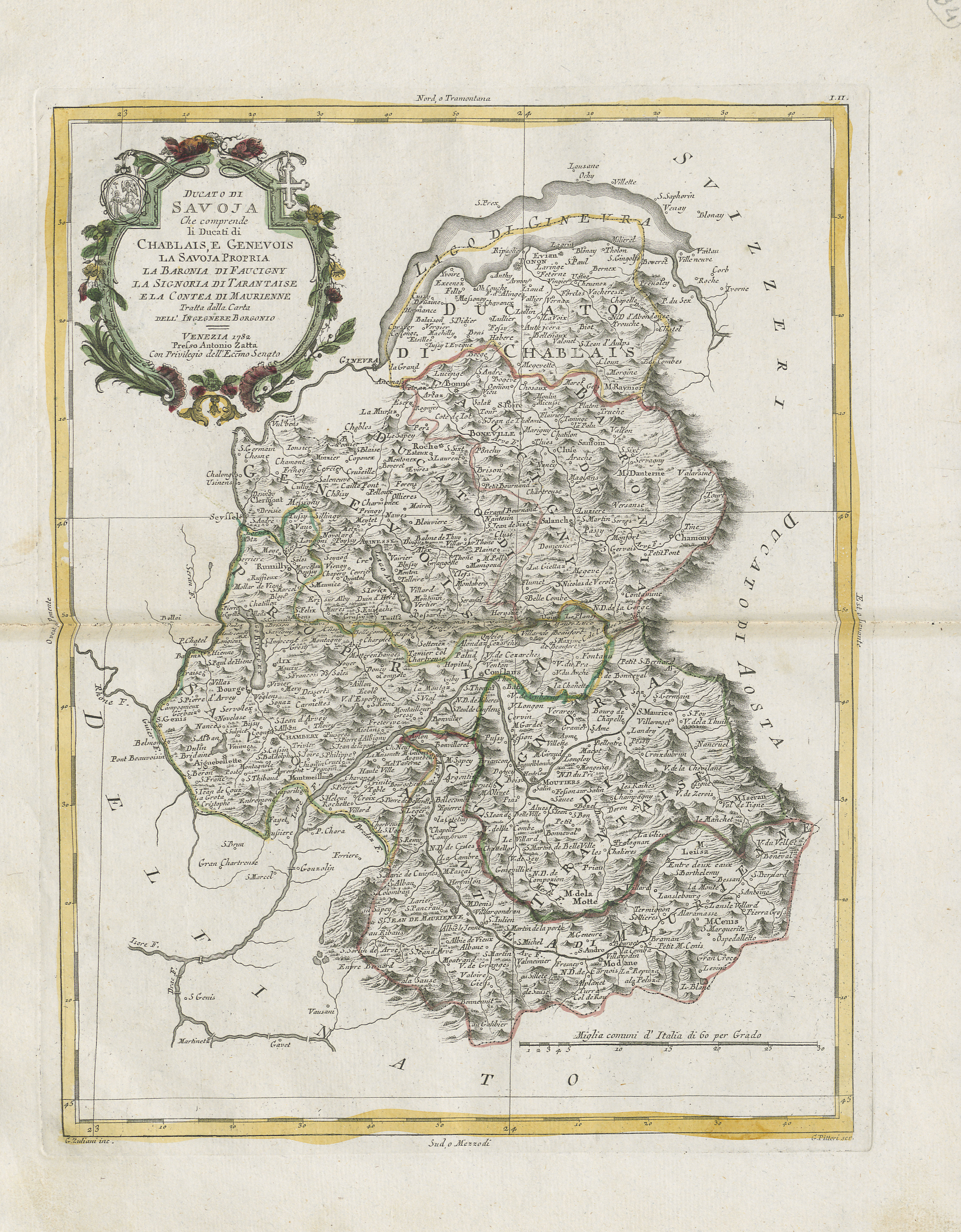 Ducato di Savoja, che comprende li Ducati di Chablais e Genevois, la Savoja propria, la Baronia di Faucigny, la Signoria di Tarantaise e la Contea di Maurienne - tratta dalla Carta dell'ingegnere Borgonio (1782).