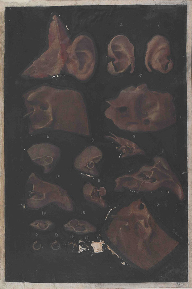 • Orecchio, osso temporale, Girolamo Fabrici Acquapendente, Fabricius, pitture colorate anatomia, De visione voce auditu, pitture colorate di anatomia