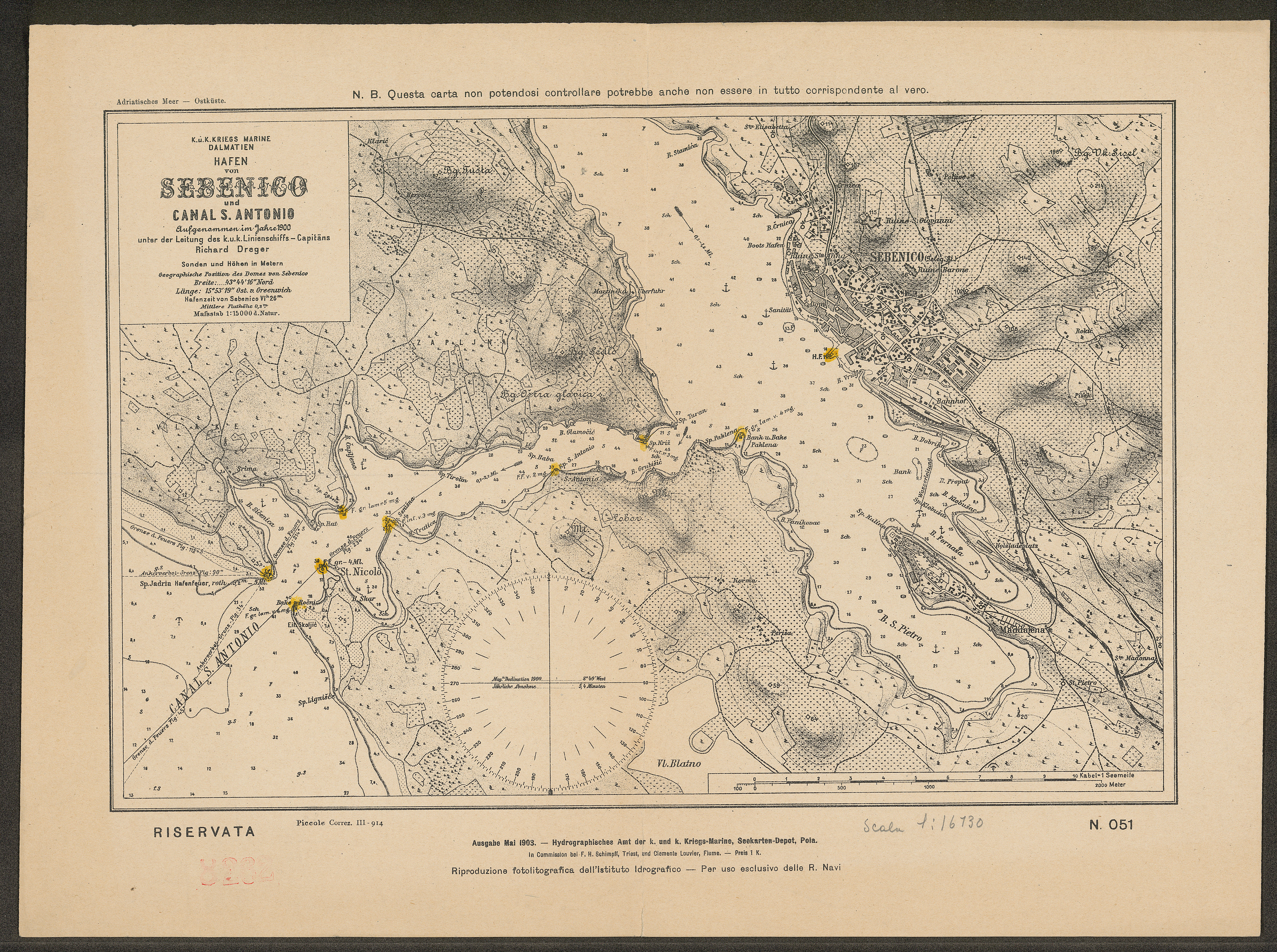 • Hafen von Sebenico und Canal S. Antonio. Adriatisches Meer.. Pola, Hydrographisches Amt der k.u.k. Kriegsmarine, 1903.