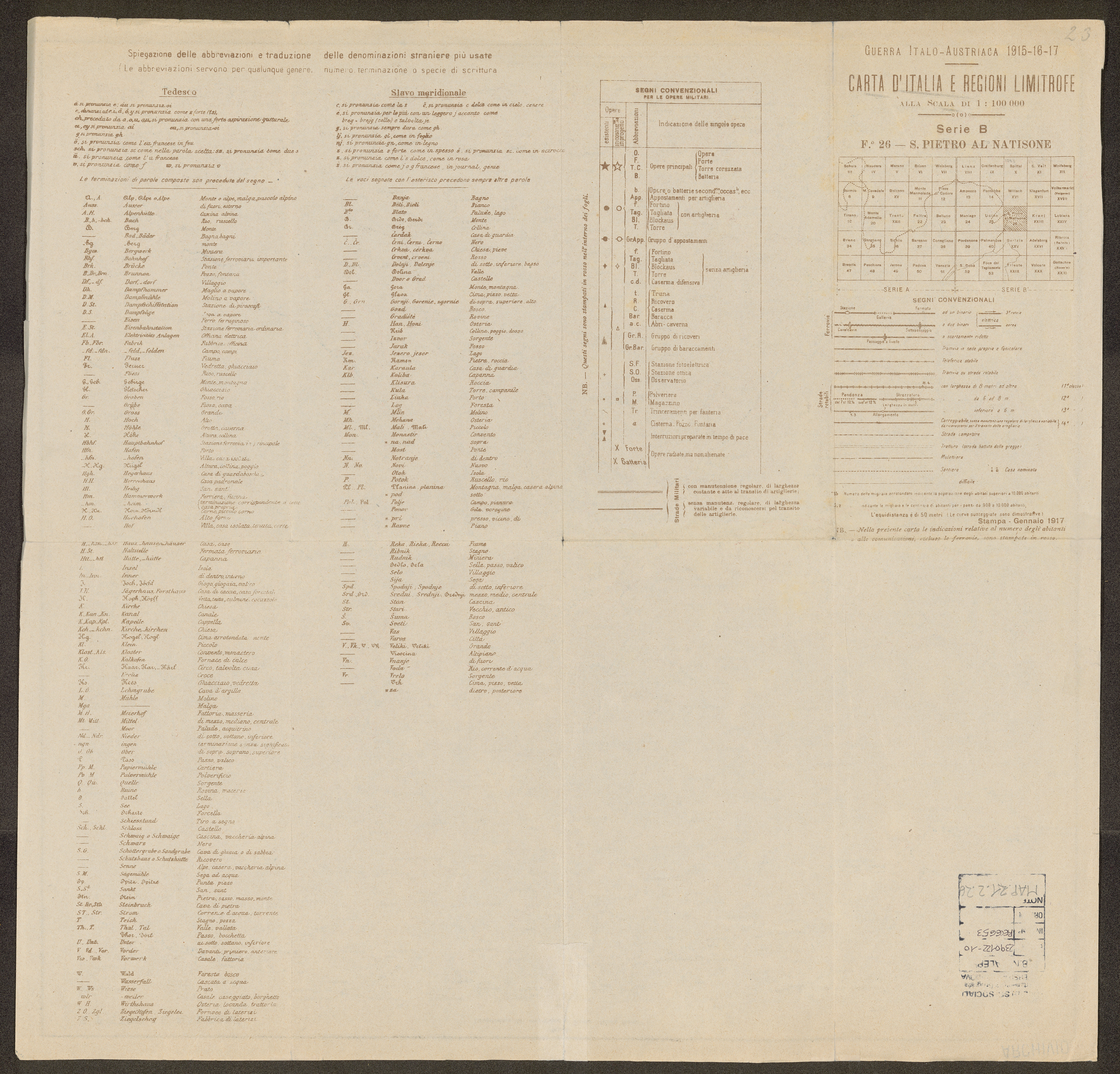 Tratta da "Carta d'Italia e regioni limitrofe, alla scala di 1:100000. Guerra Italo-Austriaca 1915-16-17."