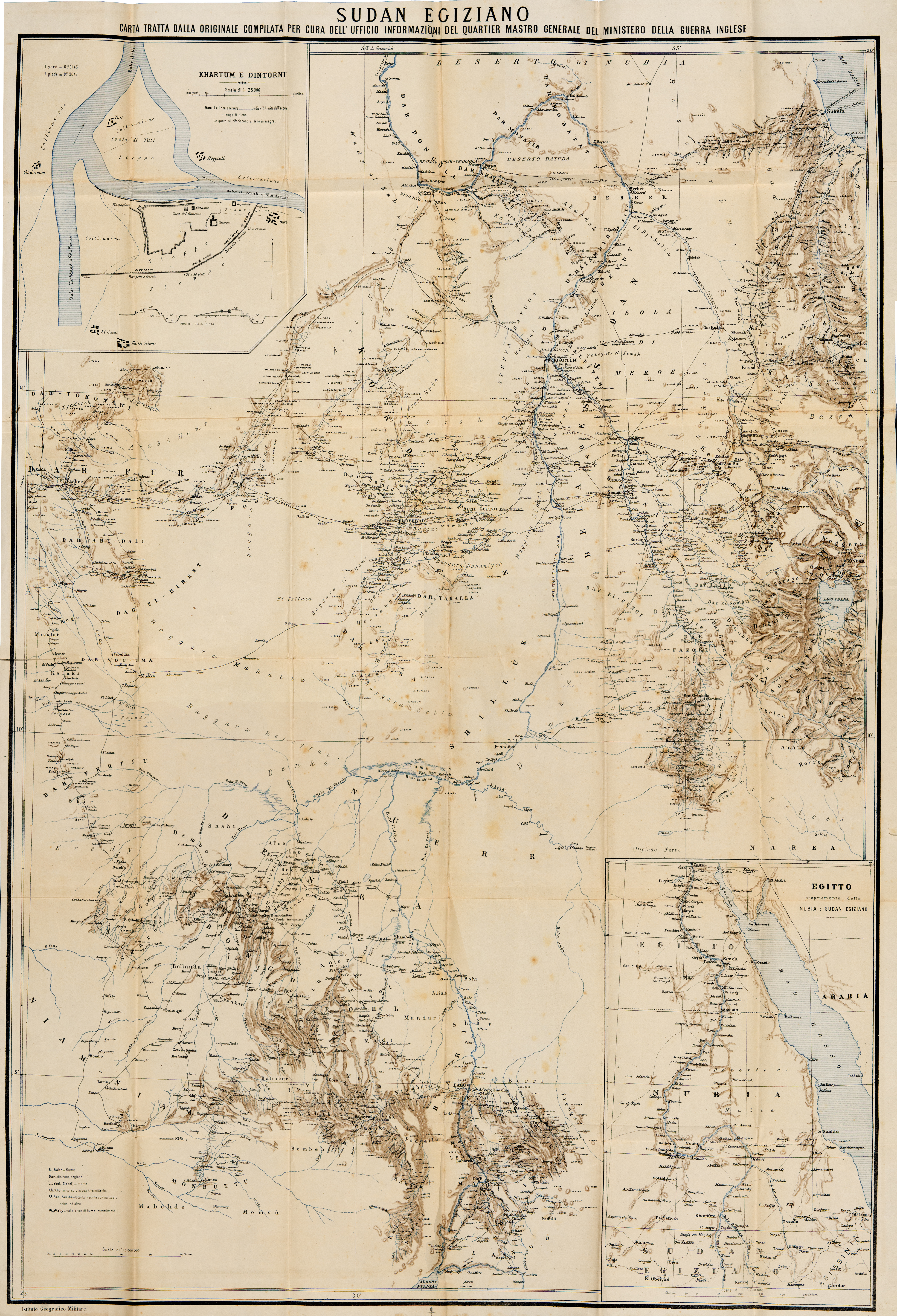 La carta riporta anche la pianta di Khartum e dintorni, scala 1:35000 (a sinistra) e la mappa dell’Egitto propriamente detto, Nubia e Sudan Egiziano, scala 1:5700000 (a destra).