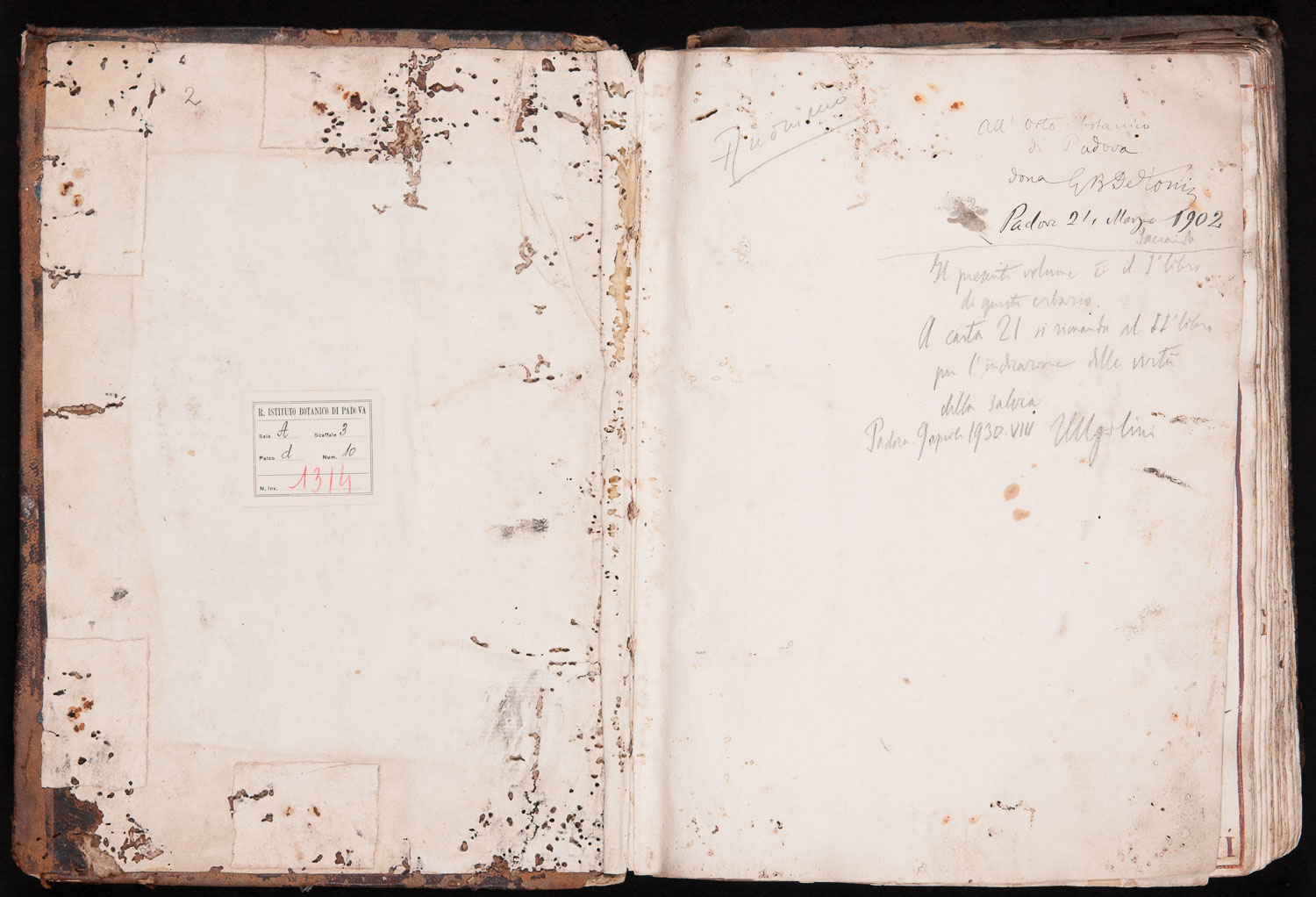 Un'altra annotazione sulla medesima carta di guardia fa riferimento alla donazione del volume con la seguente frase: "All'Orto Botanico di Padova dona G.B. De Toni. Padova, 21 marzo 1902". Da questa scritta si evince che fu in possesso del botanico Giovan Battista De Toni (1858-1925).