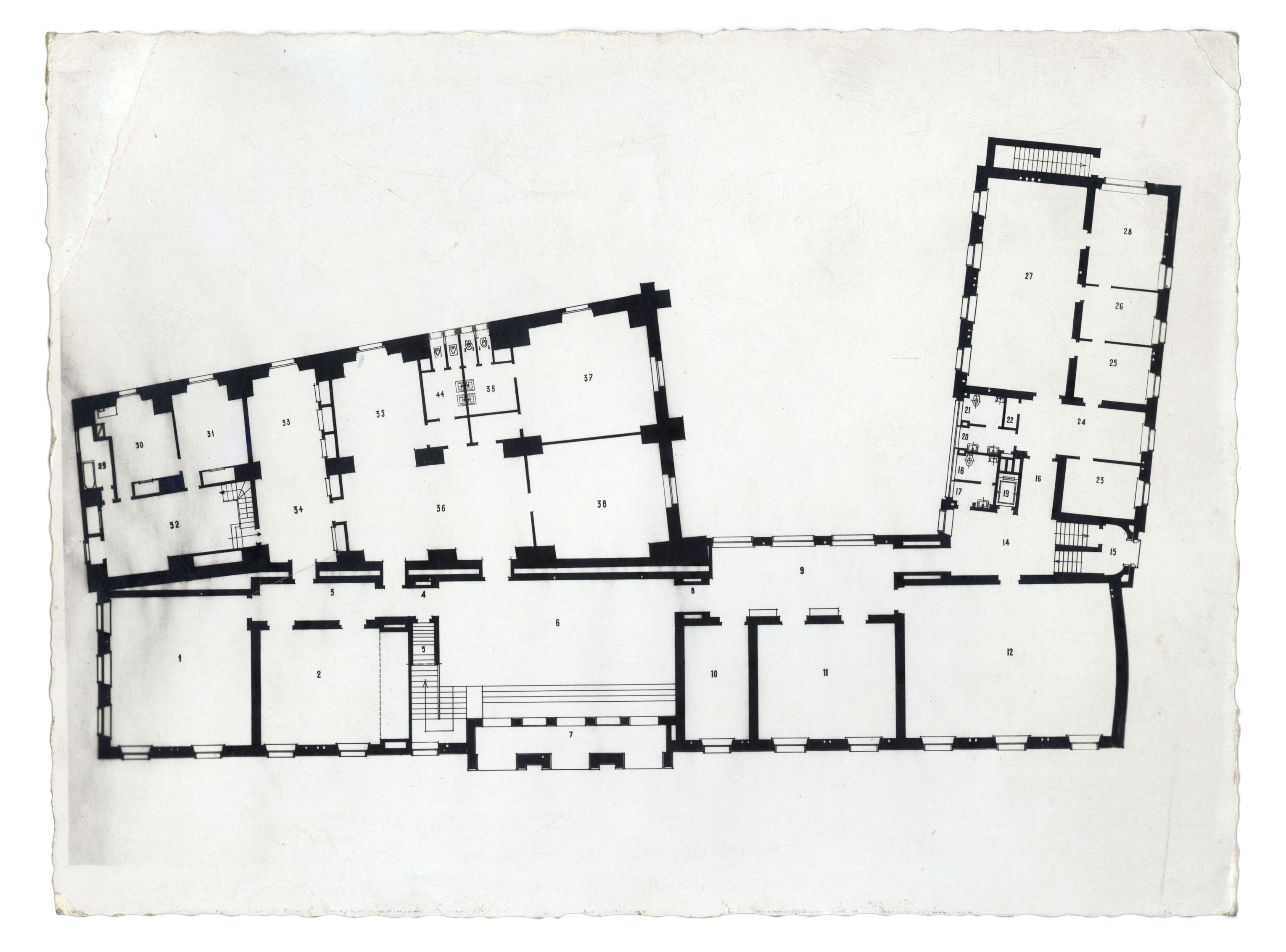 La fotografia riproduce la pianta del piano rialzato del palazzo Liviano. La numerazione indica (come si deduce dalla didascalia dattiloscritta incollata su una delle copie di minori dimensioni e conservate unitamente con la stessa segnatura) la distribuzione dei locali: numero 6 atrio principale; locali numero 1-2-11-12: aule; locale numero 10: Sala professori; locali dal numero 16 al numero 28: Istituto di filosofia; locali dal numero 29 al 34 : abitazione del custode; locali dal numero 35 al numero 44 : Sala ritrovo studenti, guardaroba e servizi.