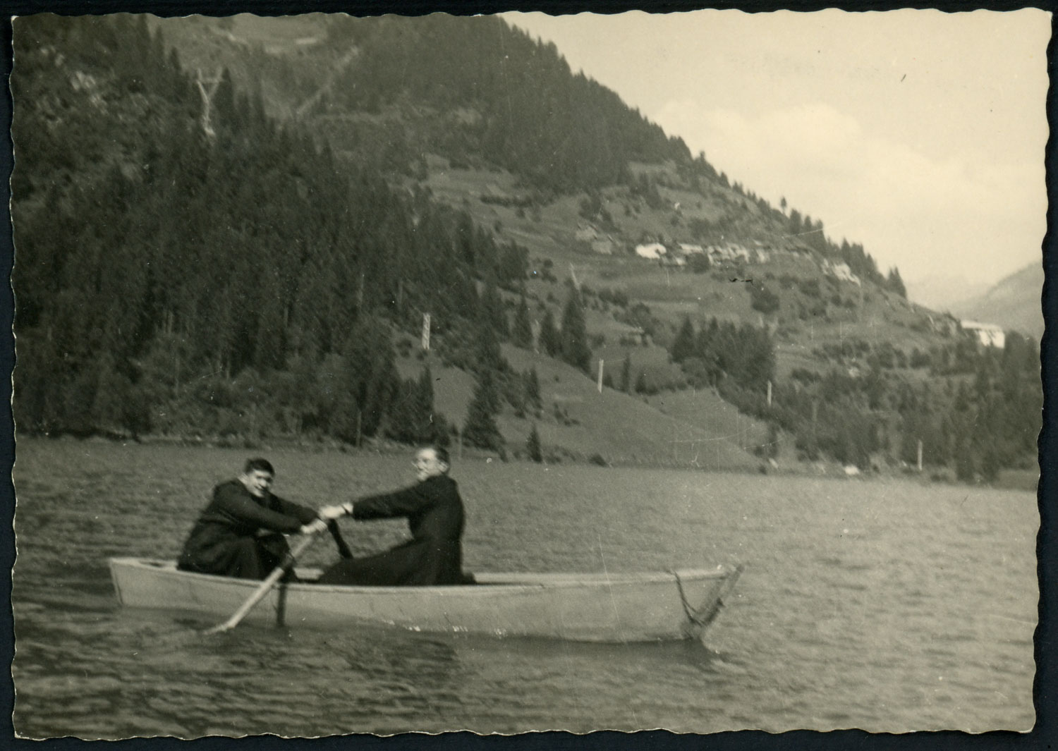 Due chierici in barca nel lago di Alleghe: Gregori, don Ezio, Martinazzo, 3 settembre 1955.