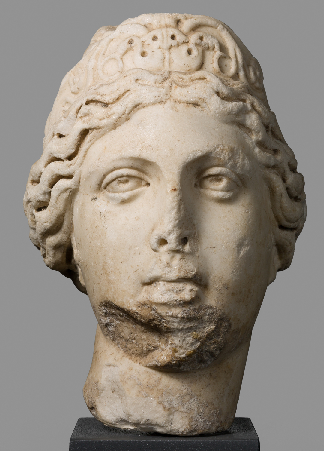 Testina femminile caratterizzata da una acconciatura a scriminatura centrale e capelli raccolti in un nodo piatto sulla nuca e in una crocchia legata con una tenia alla sommità del capo. La testina reca un diadema ornato da elementi vegetali ad andamento sinuoso e rosette che trova riscontri in ritratti imperiali di Sabina e anche in ritratti di divinità del III sec. d.C. La caratteristiche della lavorazione, tra le quali il largo uso del trapano, e l'acconciatura con crocchia alla sommità del capo analoga a pettinature di alcuni ritratti di Faustina Maggiore, orientano la datazione molto più probabilmente verso l'età antoniniana. Infine, per quanto riguarda provenienza e luogo di produzione secondo M. De Paoli la compostezza delle forme e la loro sostanziale classicità orienterebbero verso un'officina di area greca.