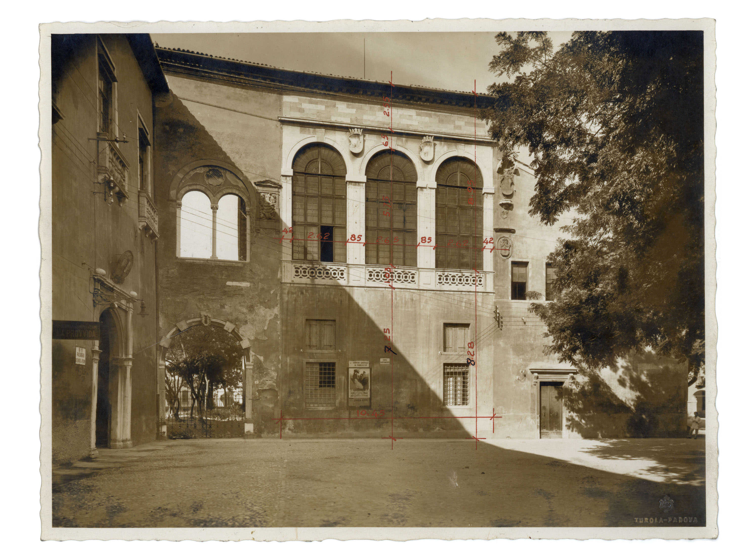 La fotografia mostra la facciata est della Sala dei Giganti e una porzione dell’edificio addossato a nord che conteneva la Scuola di Archeologia e la Regia Soprintendenza ai Monumenti del Veneto dopo essere stato liberato, nel 1912, dalla Biblioteca universitaria.