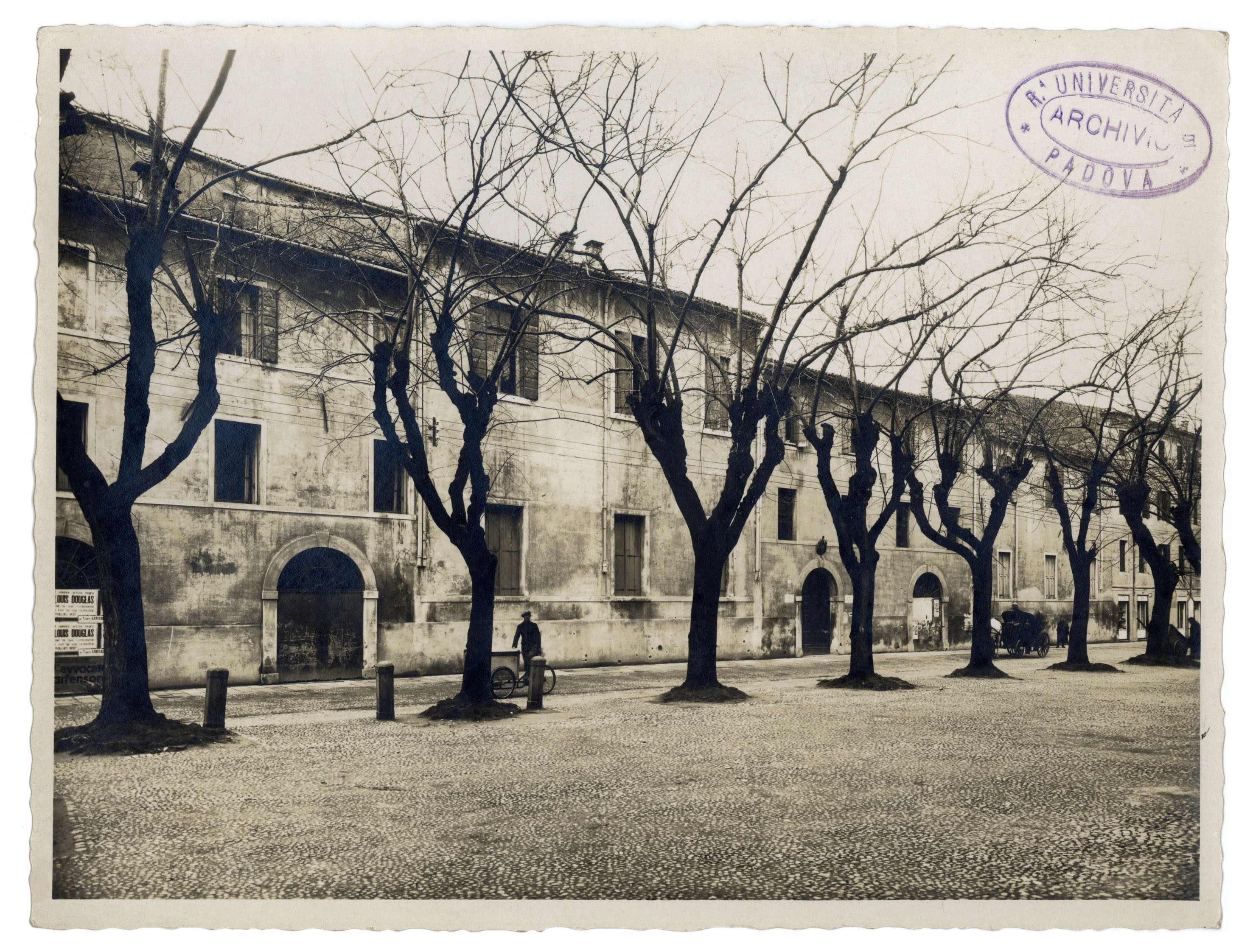 La fotografia inquadra gli edifici che sarebbero presto stati abbattuti tra piazza Capitaniato e la Sala dei Giganti, verso via Accademia. Il terzo arco a partire da sinistra dava allora accesso sia alla scuola di Archeologia che alla Soprintendenza ai monumenti del Veneto. Le due piccole targhe che si intravedono nella foto, una delle quali ben visibile durante i lavori di demolizione, indicavano appunto i due Istituti segnalati anche dallo stemma sopra all'arco di volta. Degno di nota è anche il manifesto che si può intravedere in corrispondenza del primo arco e che pubblicizza lo spettacolo del grande ballerino e coreografo afroamericano Louis Douglas che si era esibito al teatro Garibaldi.
