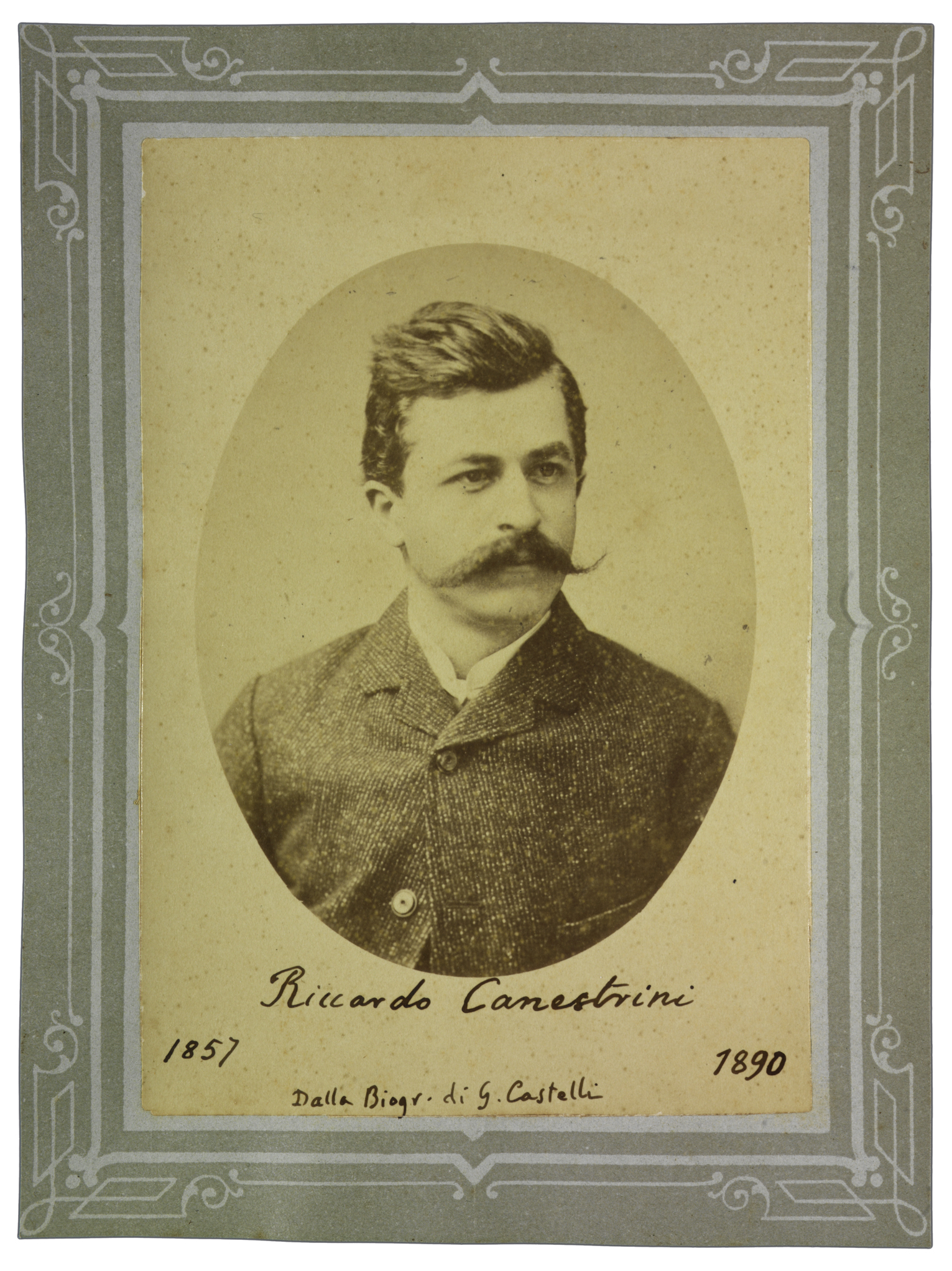 Titolo ed estremi cronologici riportati manoscritti sul recto, dove compare anche la nota: Dalla Biogr. di G. Castelli.