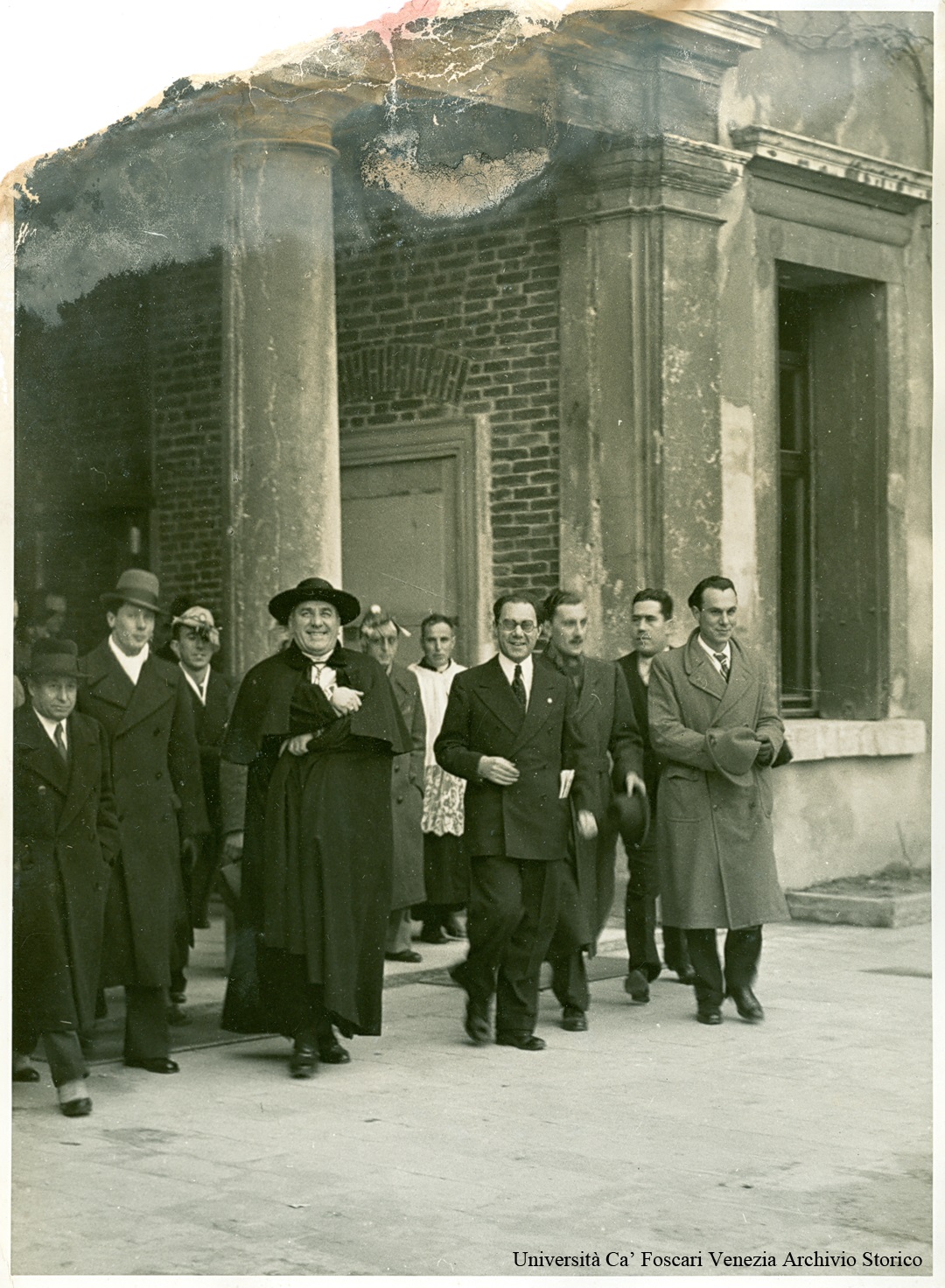 Il Patriarca di Venezia, Cardinale Adeodato Giovanni Piazza, con il rettore Agostino Lanzillo, seguiti da un gruppo di studenti e docenti dell'Istituto Universitario di Economia e Commercio (IUEC), stanno uscendo dall'ingresso di Ca' Foscari.