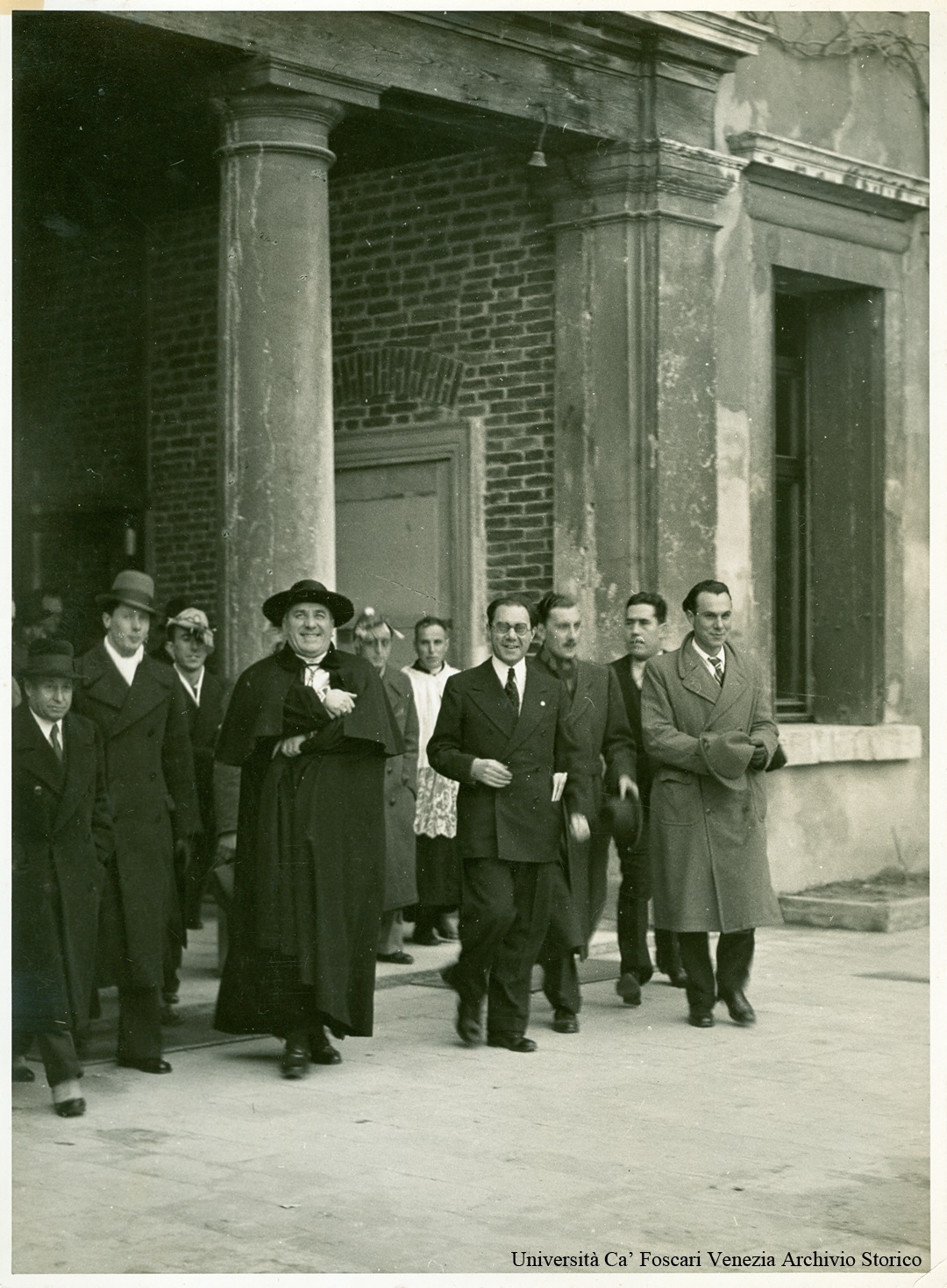 Il Patriarca di Venezia, Cardinale Adeodato Giovanni Piazza, con il rettore Agostino Lanzillo, seguiti da un gruppo di studenti e docenti dell'Istituto Universitario di Economia e Commercio (IUEC), stanno uscendo dall'ingresso di Ca' Foscari.