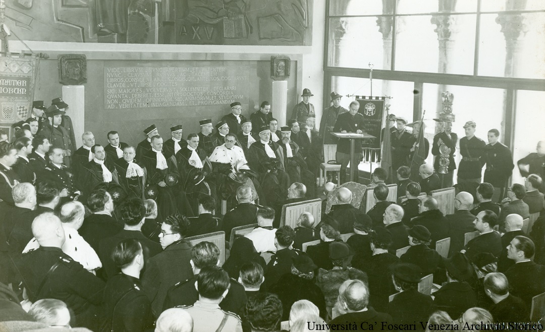 Cerimonia di inaugurazione dei locali di Ca' Foscari, restaurati da C. Scarpa, in concomitanza con l'inaugurazione dell'Anno Accademico, rimandata per questo motivo. Si svolge nella nuova Aula Magna o Aula degli Atti Accademici (attuale Aula Baratto) il 25 gennaio 1937, pochi giorni dopo il rito della benedizione.