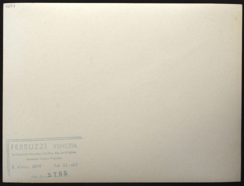 Verso della foto inv. n. 0071: timbro rettangolare a inchiostro verde del fotografo con la scritta: "Ferruzzi Venezia / corrispondente fotografico della Direz. Gen. per il Turismo / Ministero Cultura Popolare / S. Marco, 4899 Tel. 22-462".