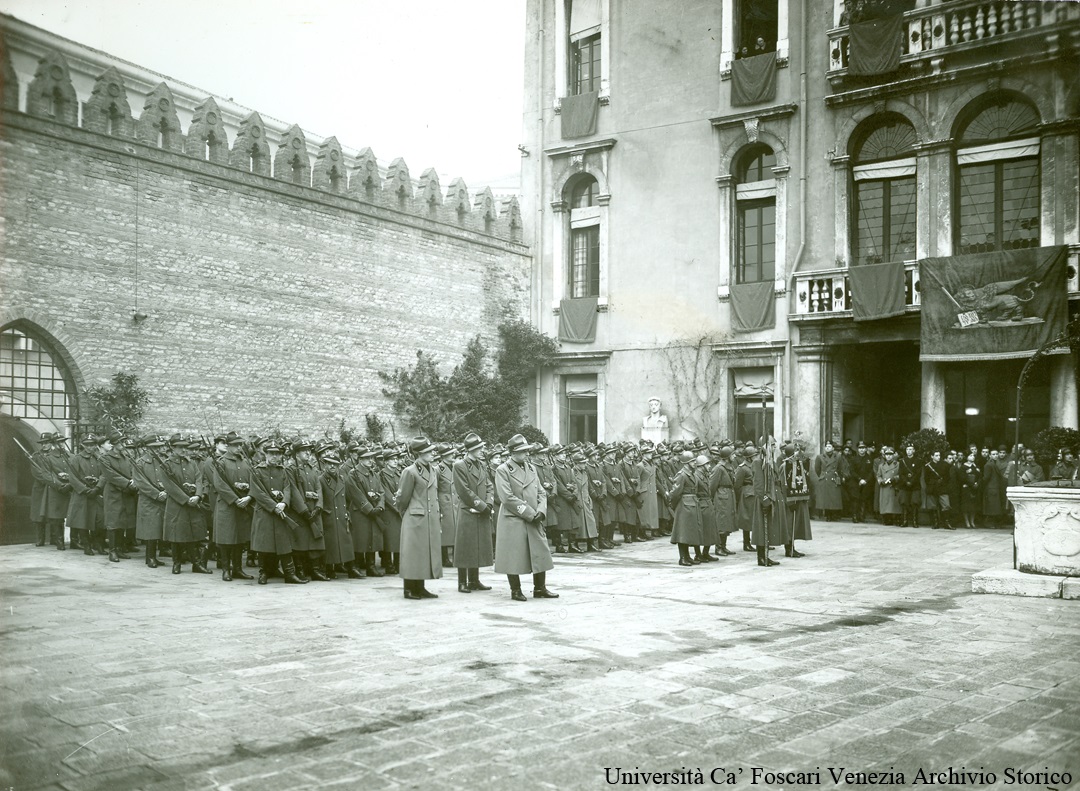 Ufficiali schierati nel cortile di Ca' Foscari per l'inaugurazione del Corso Allievi Ufficiali.