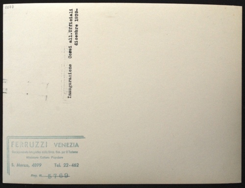 Verso della foto inv. n. 0077: timbro rettangolare a inchiostro blu del fotografo con la scritta: "Ferruzzi Venezia / corrispondente fotografico della Direz. Gen. per il Turismo / Ministero Cultura Popolare / S. Marco, 4899 Tel. 22-462".