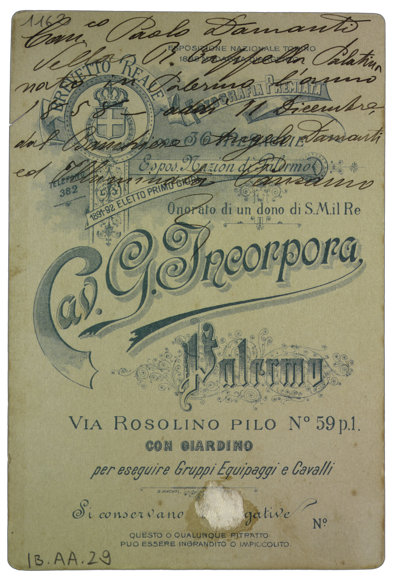 Nota manoscritta sul verso: Can.co Paolo Damanti della R. Cappella Palatina nato in Palermo l’anno 1858-addì 11 Dicembre dal Barbiere Angelo Damanti ed Illuminata Panramo.