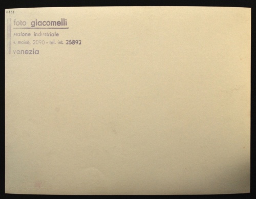 Verso della foto inv. n. 0121: timbro a inchiostro blu del fotografo con la scritta: "foto giacomelli / sezione industriale / s. moisè, 2090 - tel.int. 25892 / venezia" in alto a sinistra.