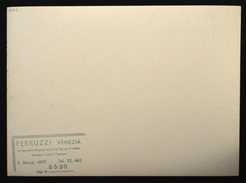 Verso della foto inv. n. 0122: timbro a inchiostro verde del fotografo con la scritta: "Ferruzzi Venezia / corrispondente fotografico della Direz. Gen. per il Turismo / Ministero Cultura Popolare / S. Marco, 4899 Tel. 22-462" e timbro del negativo: Neg. n. 5523. Posti in basso a sinistra.