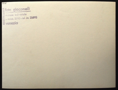 Verso della foto inv. n. 0068: timbro a inchiostro blu del fotografo con la scritta: "foto giacomelli / sezione industriale / s. moisè, 2090 - tel.int. 25892 / venezia". Posto in alto a sinistra.