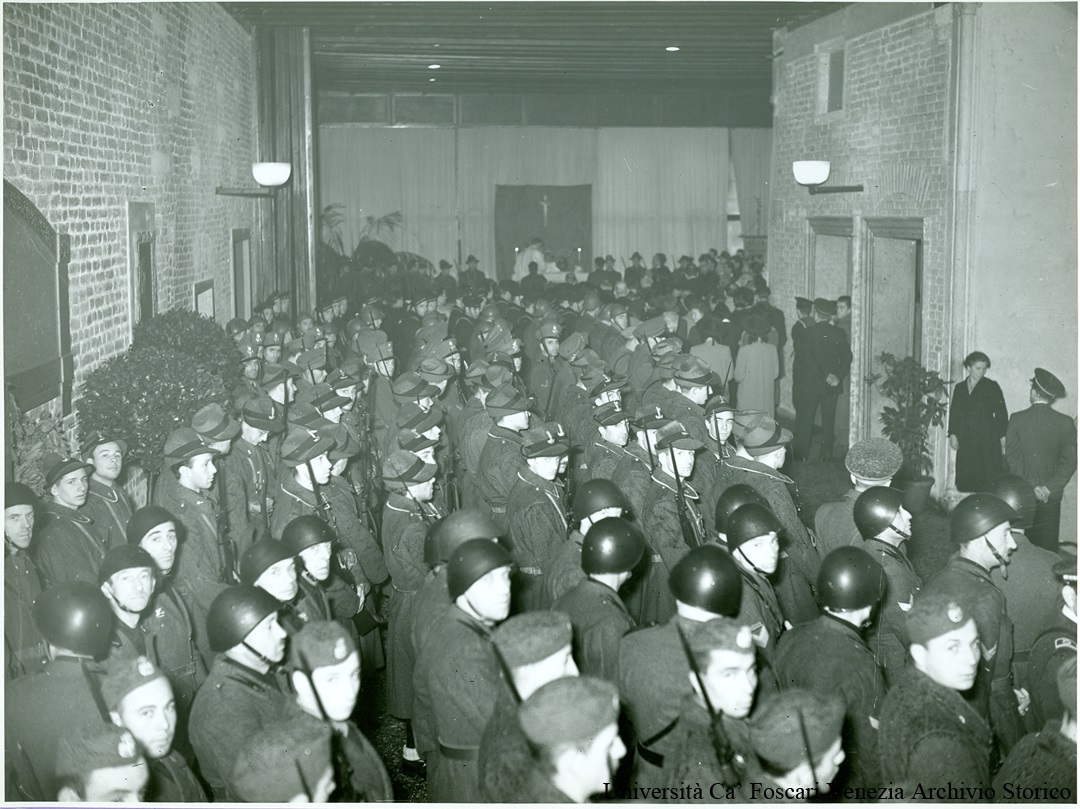 Soldati in orbace ed elmetto, schierati in file, nel salone al primo piano di Ca'Foscari in occasione dell'inaugurazione dell'A.A. 1941-1942.