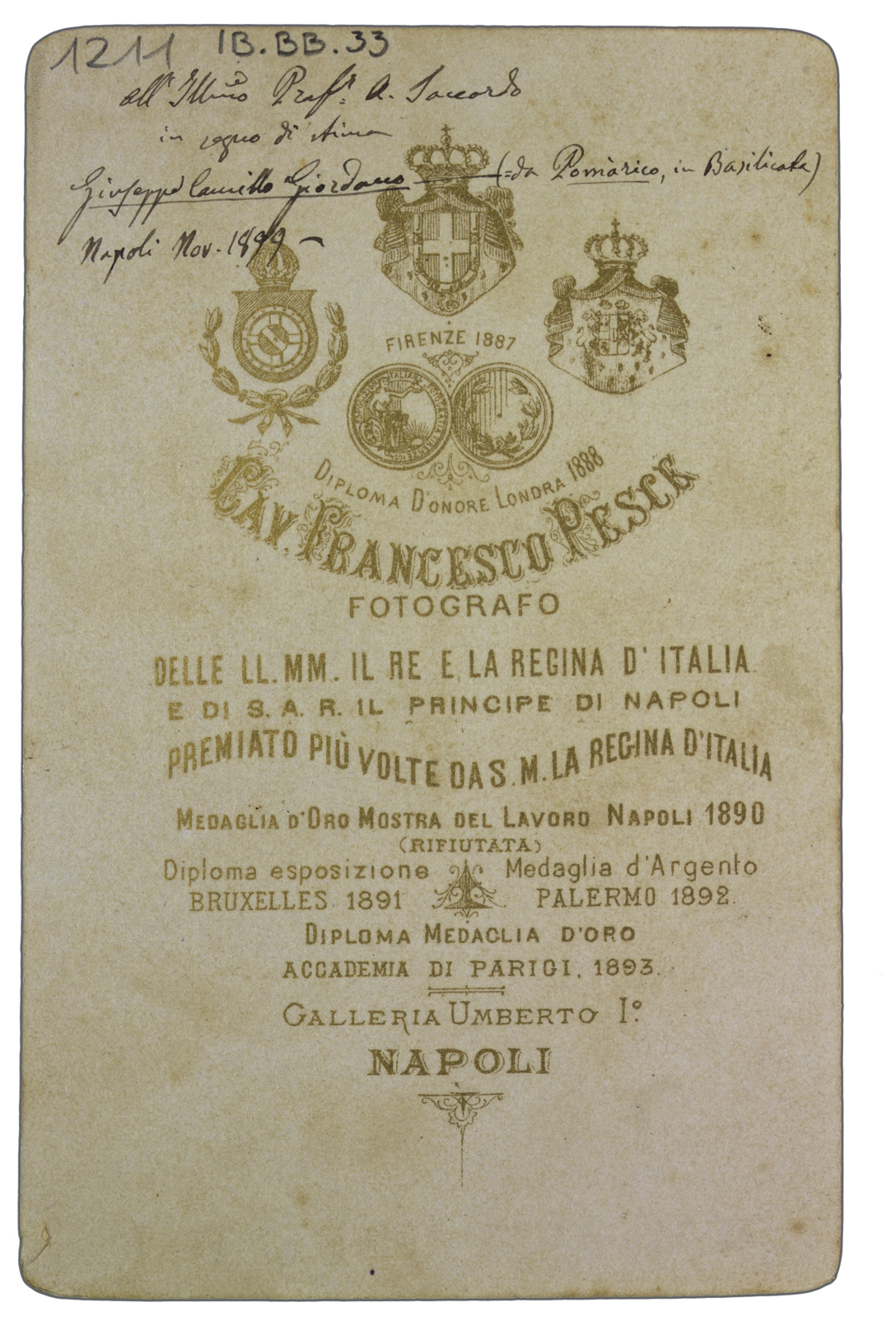 Nota manoscritta sul verso: all’Ill.mo Prof. A. Saccardo in segno di stima Giuseppe Camillo Giordano (da Pomarico, in Basilicata) Napoli Nov. 1899.