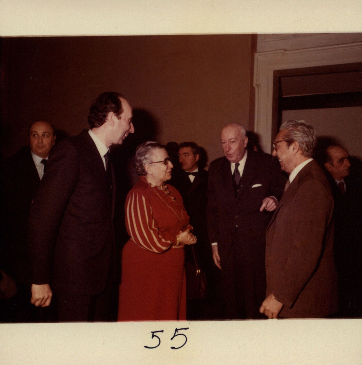 Il ministro Franca Falcucci al rinfresco tenuto nel salone del Rettorato a Ca' Giustinian de Vescovi, mentre conversa con Feliciano Benvenuti, Giovanni Castellani e un ospite non identificato.