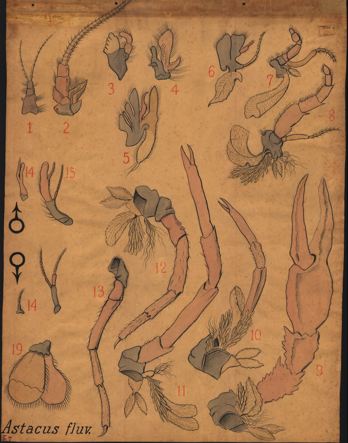 Sono illustrate in ordine da 1 a 16, dalle più anteriori alle posteriori, le appendici di un gambero: prima antenna, seconda antenna, mandibola, prima mascella, seconda mascella, primo massillipede, secondo massillipede, terzo massillipede, primo arto ambulacrale (chelipede), secondo arto ambulacrale, terzo arto ambulacrale, quarto arto ambulacrale, quinto arto ambulacrale, primo pleopode, secondo plepode (nel maschio e nella femmina), uropode.