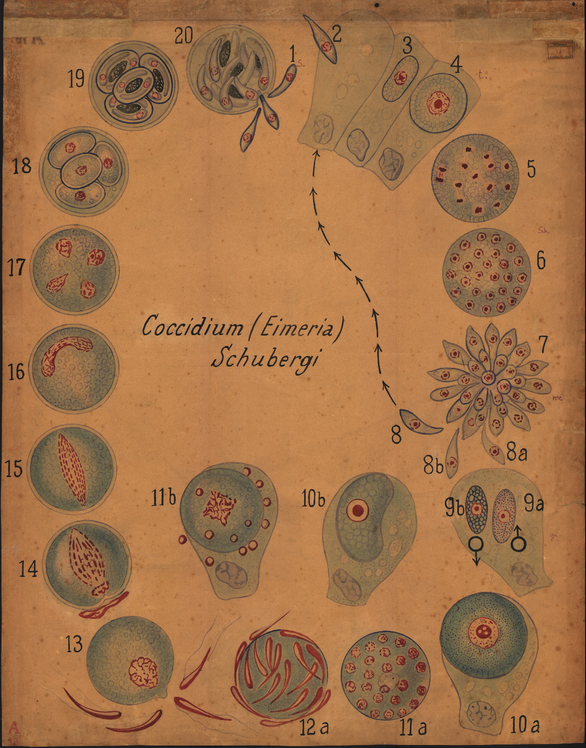 Parassita endocellulare dell’epitelio intestinale di Lithobius (Chilopoda, centopiedi); è rappresentato il ciclo vitale con i differenti stadi. L’infezione inizia con l’ingestione delle oocisti (20). Nell’intestino gli sporozoiti (1,2) dapprima escono dalle sporocisti e poi penetrano nelle cellule dell’ospite, diventano accrescendosi trofozoiti (3-6), che vanno incontro a due o tre fasi schizogoniche. I merozoiti (7,8) formatisi escono dalla cellula per infettarne di nuove. Quando viene raggiunto un certo grado d’infezione i merozoiti si trasformano in gamonti, macro- e microgamonti (9, 10), che danno origine a macro- e microgametociti (11,12) : dopo la fecondazione dei gameti (13), lo zigote diventa oocisti e va incontro a meiosi e ad una successiva mitosi (14-17). Le oocisti (18-20), infine, contengono 4 sporocisti con 2 sporozoiti ciascuna.