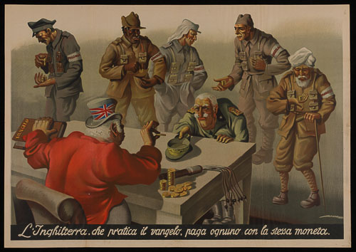 John Bull, con la mano sinistra sul Vangelo, che paga Vittorio Emanuele III e cinque soldati: un polacco, un senegalese, uno jugoslavo, un marocchino e un francese (Degaullista).