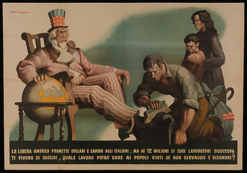 Testo del manifesto: "La libera America promette dollari e lavoro agli italiani; ma se 12 milioni dei suoi lavoratori disoccupati vivono di sussidi, quale lavoro potrà dare ai popoli vinti se non servaggio e disonore?"