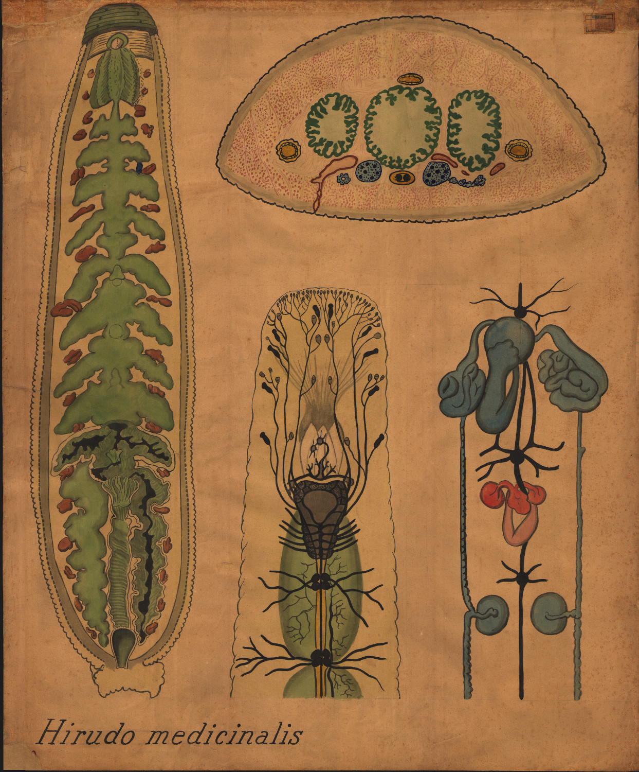 Anatomia interna. Visione ventrale: sistema digerente con gozzo, ciechi, retto e ano (in verde); paia di nefridi lungo il corpo.