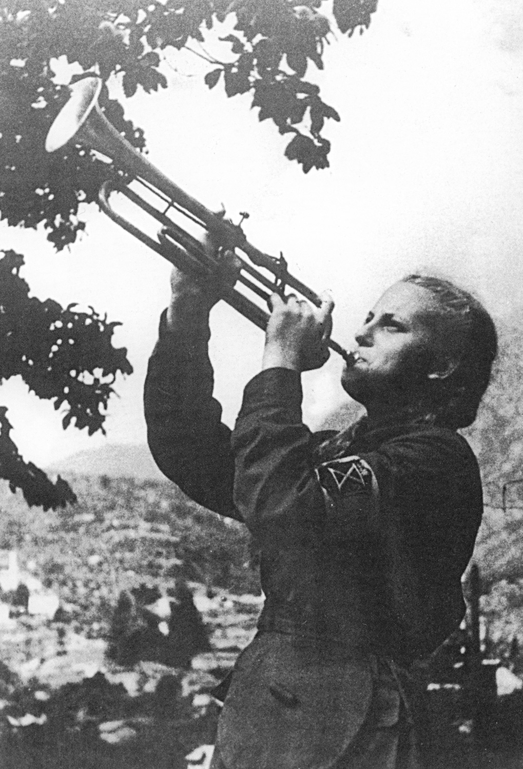 Fotografia in bianco e nero di un'ausiliaria della Decima flottiglia MAS che suona l'adunata.