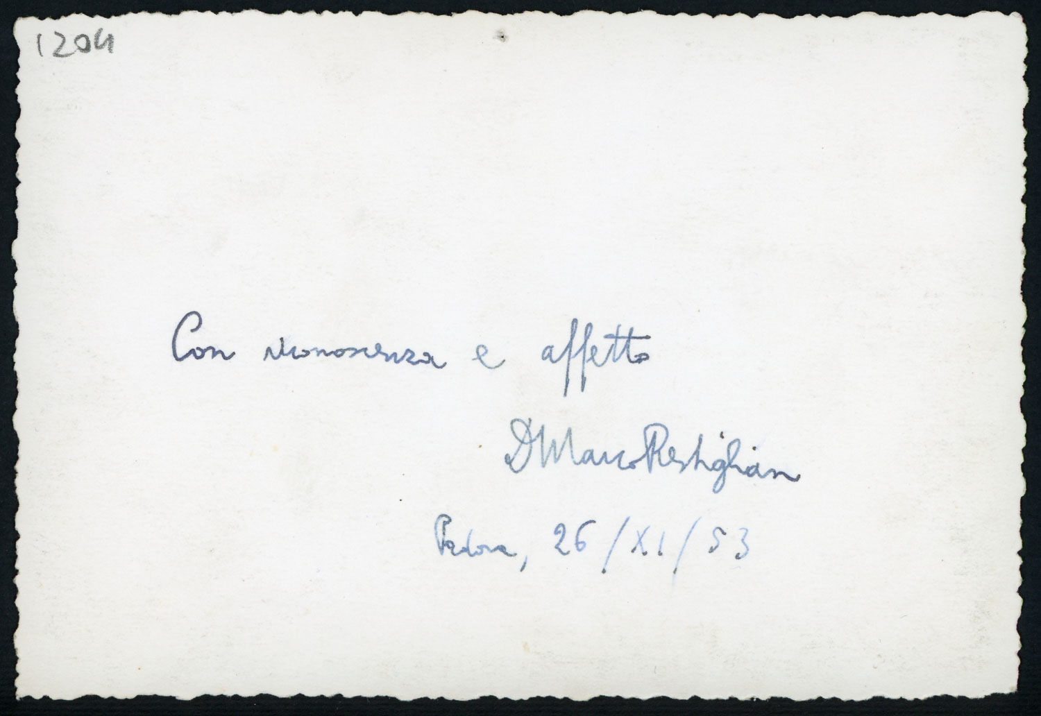 Laurea di don Marco Restiglian. Alla sua destra, don Alvise Dal Zotto, alla sua sinistra don Luigi Sartori. In seconda fila, il secondo da sinistra è don Angelo Gambasin, il terzo don Vittorio Piccolo, 26 novembre 1953, retro della foto.