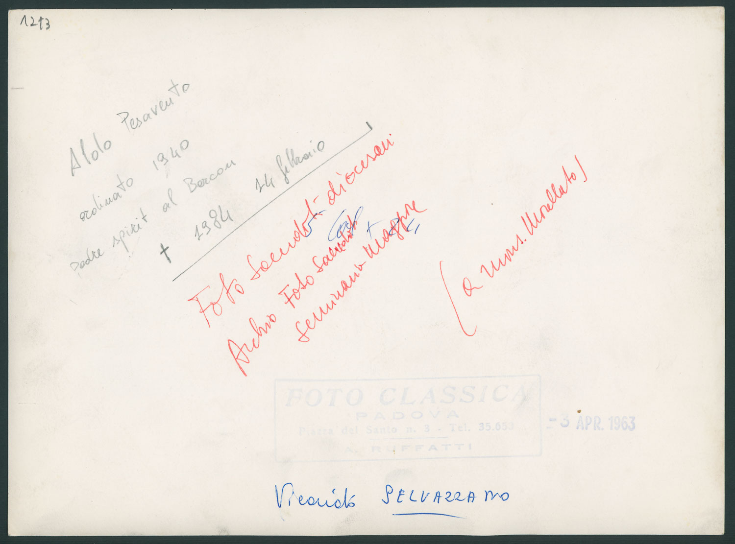 Nota manoscritta sul retro: Aldo Pesavento, ordinato 1940, padre spirituale al Barcon, + 1984, 14 febbraio. Foto sacerdoti dioocesani, Archivio foto sacerdoti Seminario Maggiore (a Mons. Morellato); Vicariato di Selvazzano. Timbro: Foto Classica Ruffati Padova, 3 aprile 1963.