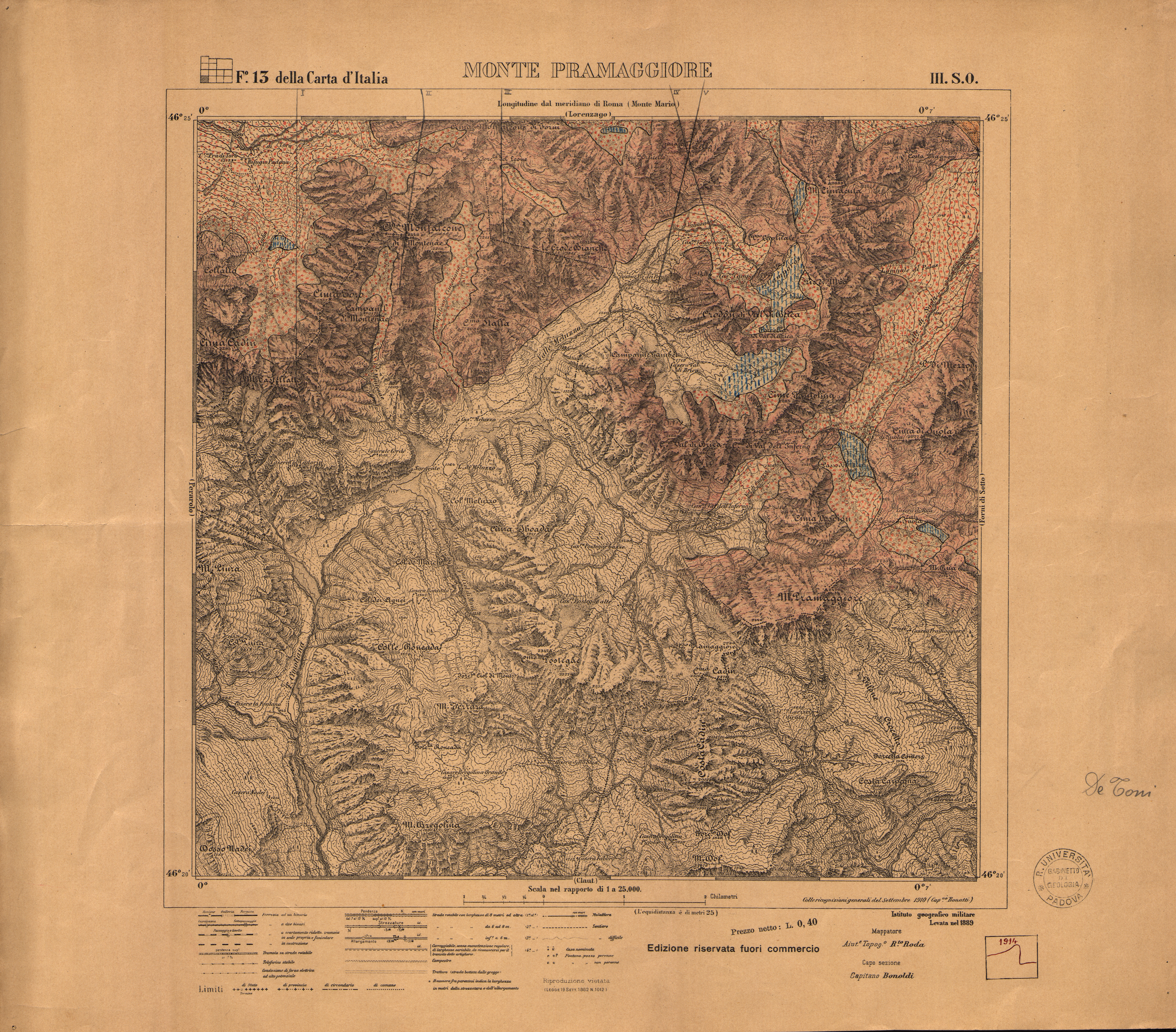 Rilevamento disegnato sulla base di: Monte Pramaggiore - Foglio 13 della Carta d'Italia, III. S.O., scala 1:25 000 (S.l.: IGM, 1889 - ediz. riservata fuori commercio). Firma di Antonio De Toni sul lato destro della carta