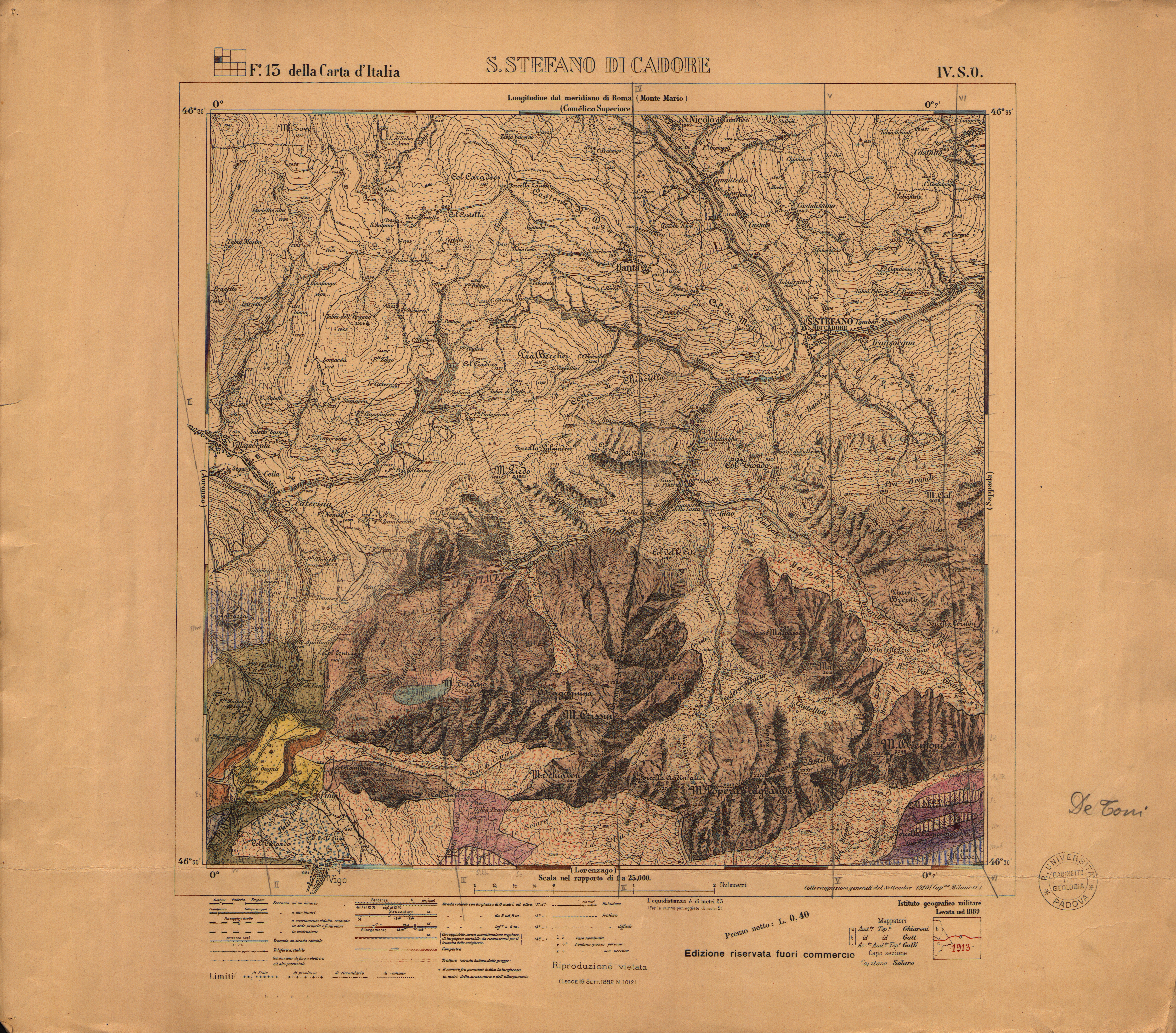 Rilevamento disegnato sulla base di: S. Stefano di Cadore - Foglio 13 della Carta d'Italia, IV. S.O., scala 1:25.000 (S.l.: IGM, 1889 - ediz. riservata fuori commercio). Firma di Antonio De Toni sul lato destro della carta