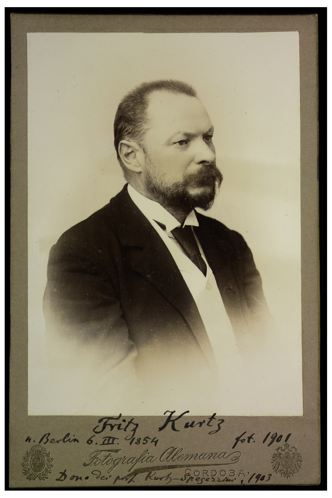Nota manoscritta su carta incollata sul verso: Fritz Kurtz * in Berlin 6.III.1854; phot. in Cordoba, Argentina, XI.1901. Fŭr Herr Professor Pier-Andrea Saccardo. Padua.