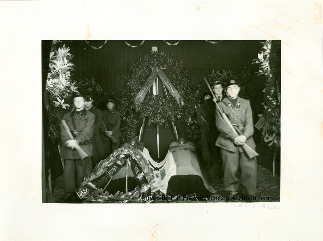 Nella camera ardente allestita in Ca'Foscari, in luogo non identificato, sotto un baldacchino, sono collocati i feretri dei due goliardi, mutilato Antonio Marras e tenente Giacomo Luxardo, circondati da ghirlande funebri e vegliati da sei soldati schierati.