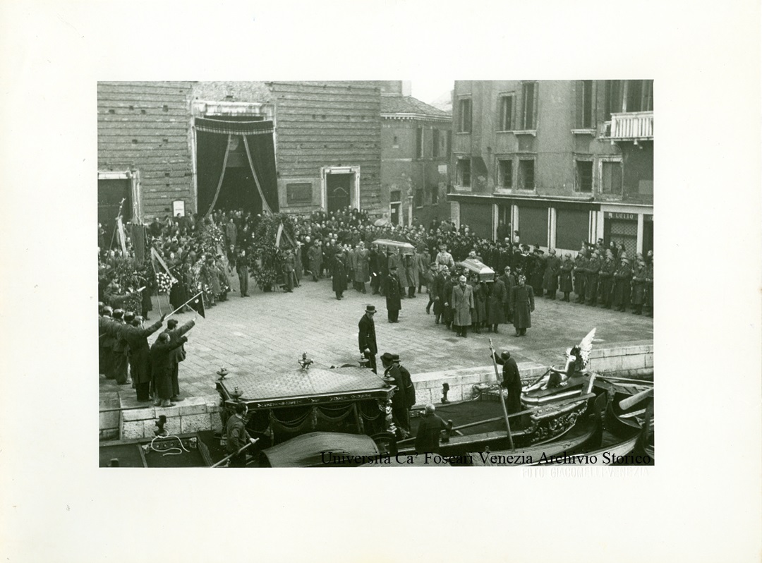 Uscita dei due feretri di Antonio Marras e Giacomo Luxardo, dalla chiesa di San Pantalon verso il battello funebre, tra due ali di folla e soldati schierati.