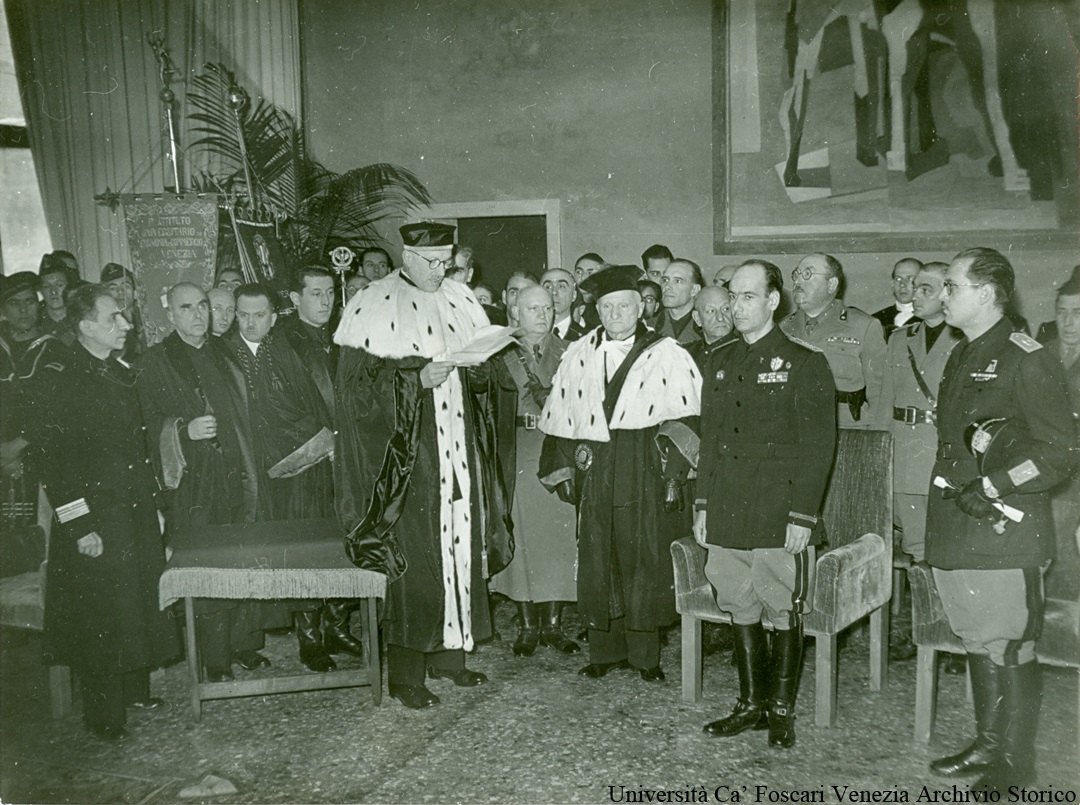 Il rettore Gino Zappa legge il discorso per la cerimonia inaugurale dell'A.A. 1941-1942, allestita nel salone al primo piano di Ca'Foscari, a docenti e gerarchi in orbace. Su uno stendardo, in secondo piano, si legge la scritta: "R. Istituto Universitario di Economia e Commercio Venezia". Sullo sfondo si scorge parte dell'affresco di M. De Luigi "La Scuola" (ora posto in Aula Baratto).
