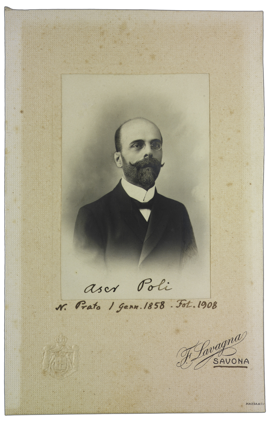 Nota manoscritta sul verso: Prof. dott. Aser Poli n. in Prato (Toscana) il 1° gennaio 1858, laureato in sc. nat. nel 1881 all’Univ. di Roma, prof. di St. nat. e Preside del R. Istituto Tecnico e Nauticodi Savona. Fotogr. Sett. 1908.
