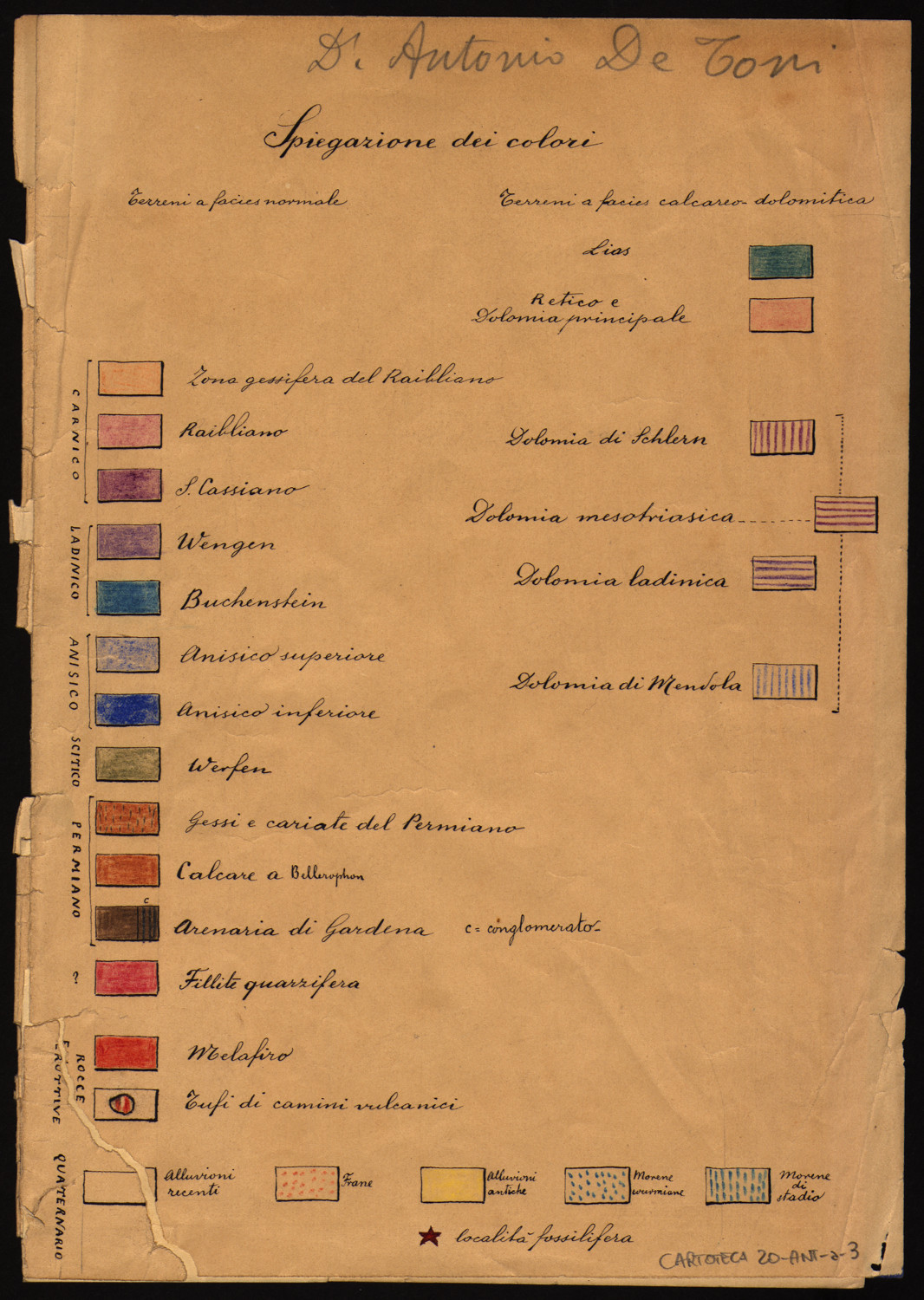 Legenda della scala geologica adottata da Antonio De Toni per i rilevamenti condotti nella zona delle Dolomiti occidentali.
