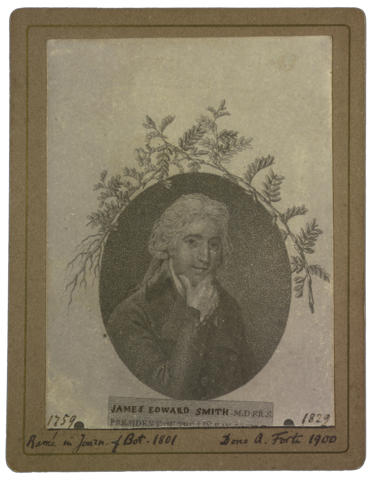 Titolo sul recto, sotto il quale compare la nota a caratteri tipografici: President of the [Linnean Society]. Presenti anche gli estrmi cronologici e la nota manoscritta: Rame in Journ of Bot. 1801; Dono A. Forti 1900.