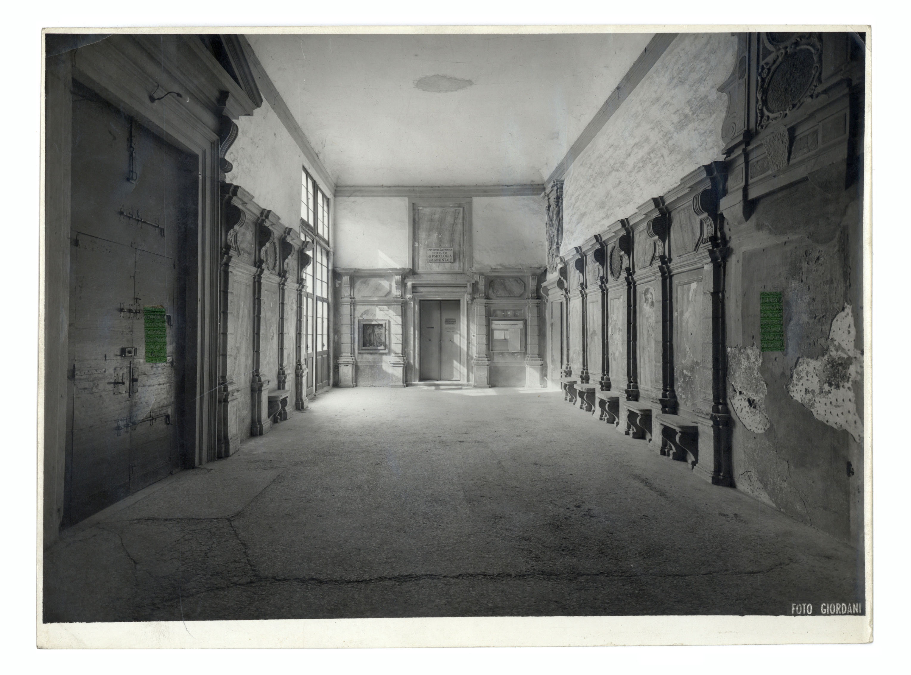 Palazzo del Capitanio. Sala delle Edicole al primo piano nello stato precedente ai lavori del 1965. La sala delle Edicole dava allora accesso all'istituto di Psicologia sperimentale come indicato chiaramente sopra alla porta in fondo alla sala.