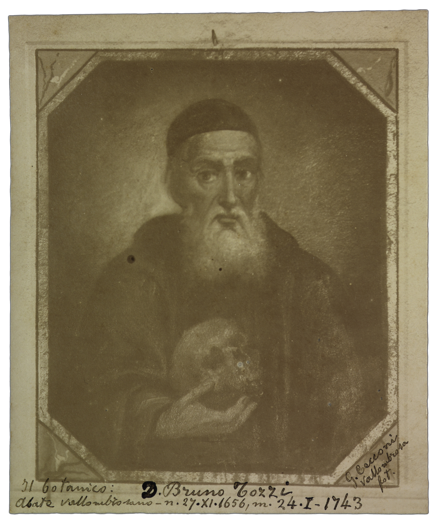 Nota manoscritta sul recto: Il botanico: D. Bruno Tozzi, abate Vallombrosano - n. 27.XI.1656, m. 24.I.1743; G. Cecconi Vallombrosa fot. Note manoscritte sul verso: Fotogr. da un affresco nella chiesa del cenobio di Vallombrosa ott. 1904; Dono del Dr. Giac. Cecconi.
