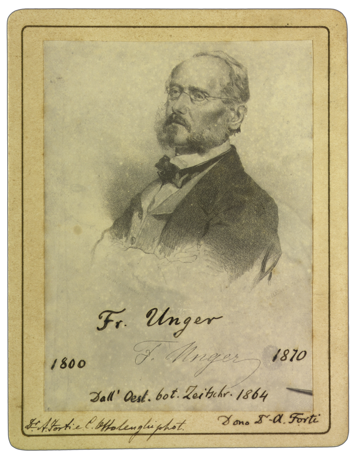 Titolo ed estremi cronologici riportati manoscritti sul recto, dove compaiono anche le note: Fr. Unger 1800-1870; Dall’Oest. bot. Zeitschr. 1864; Dr. Achille Forti e C. Ottolenghi phot.; Dono Dr. A. Forti.