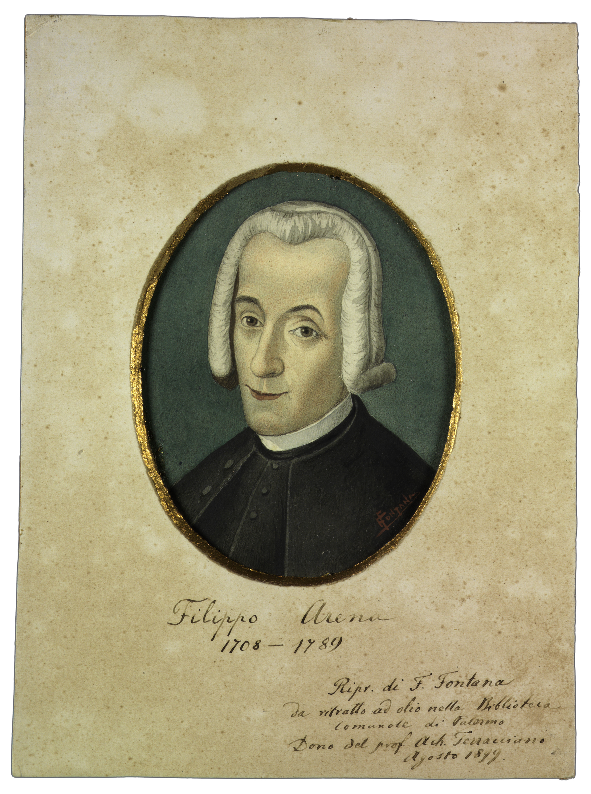 Nota manoscritta sul verso: Filippo Arena da Piazza Armerina (Sicilia) nato nel 1708 morto nel 1789 dalla bibblioteca comunale di Palermo.