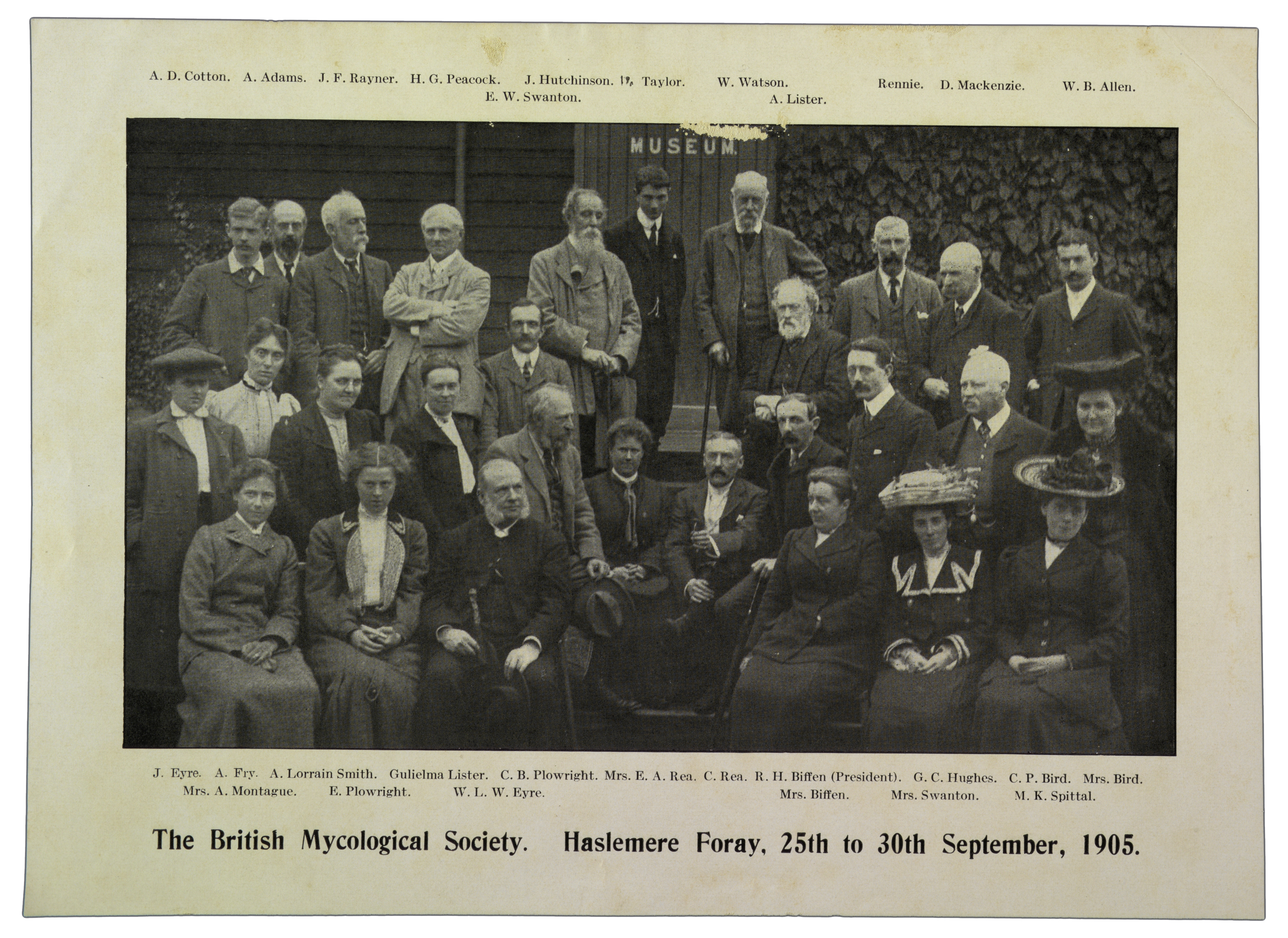 A[rthur] D[isbrowe] Cotton (1879-1962), A.Adams, J.F.Rayner, H.G.Peacock, J, Hutchinson, D.Taylor, W.Watson, Rennie, D.Mackenzie, W.B.Allen, E[rnest] W[illiam] Swanton (1870-1958), A.Lister, J.Eyre, A.Fry, A[nnie] Lorrain Smith (1854-1937), Gulielma Lister (1860-1949), C[harles] B[agge] Plowright (1849-1910), Mrs. E.A.Rea, C[arleton] Rea (1861-1946), R[owland] H[enry] Biffen (President), G.C.Hughes, C.P.Bird, Mrs. Bird, Mrs. A.Montague, E.Plowright, W.L.W.Eyre, Mrs. Biffen, Mrs. Swanton, M.K.Spittal.